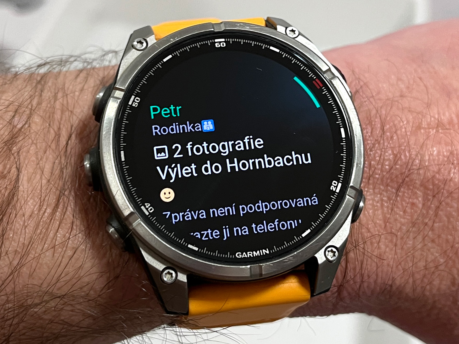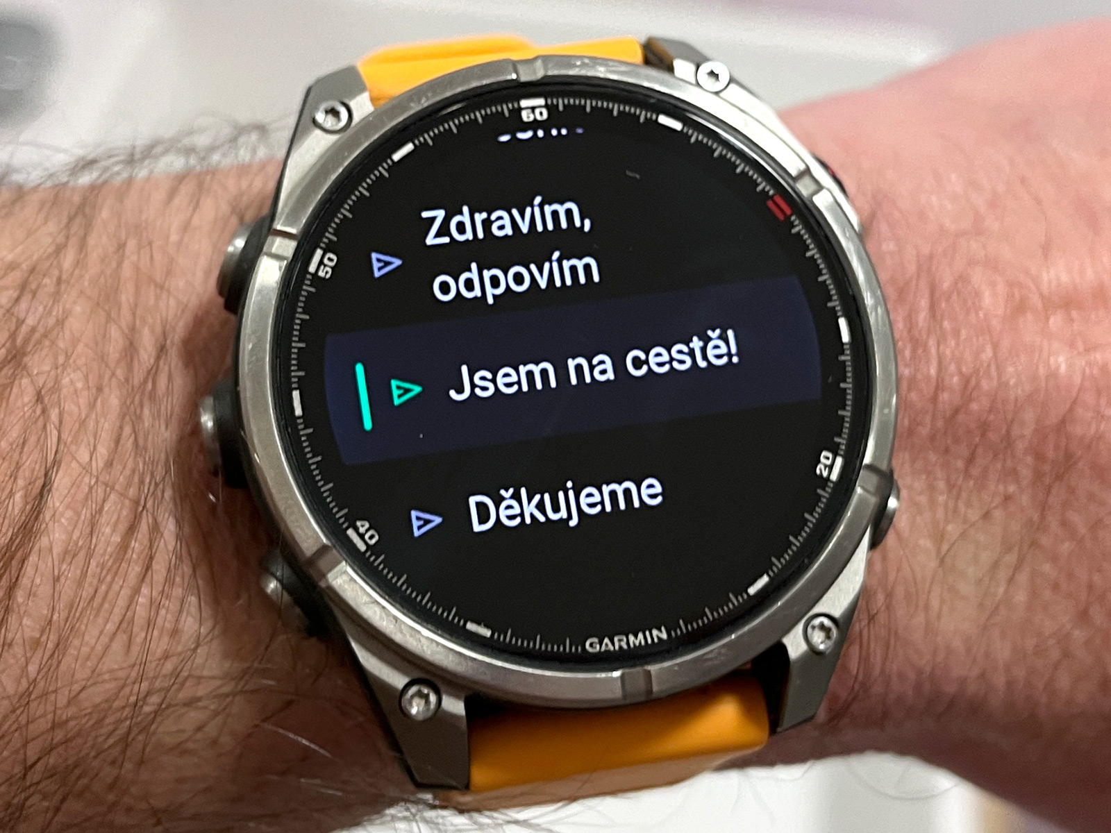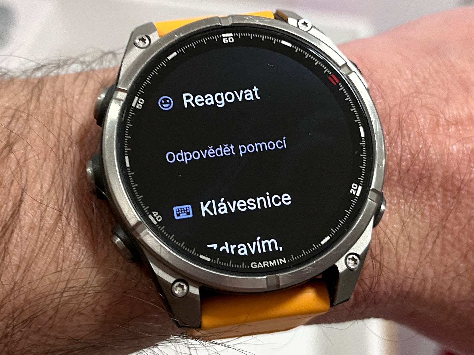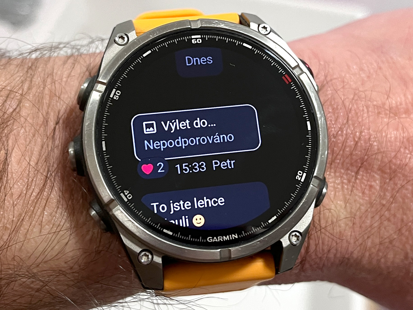 Hodinky Garminu nejsou pravé chytré hodinky. Zprávy zde fungují jen ve formě notifikací s tím, že pouze Android na ně umí odpovídat přednastavenými zprávami; iPhone má smůlu. Když máte hodinky připojení k jablečnému mobilu, neuvidíte ani obrázky. Prostě omezení platformy.
