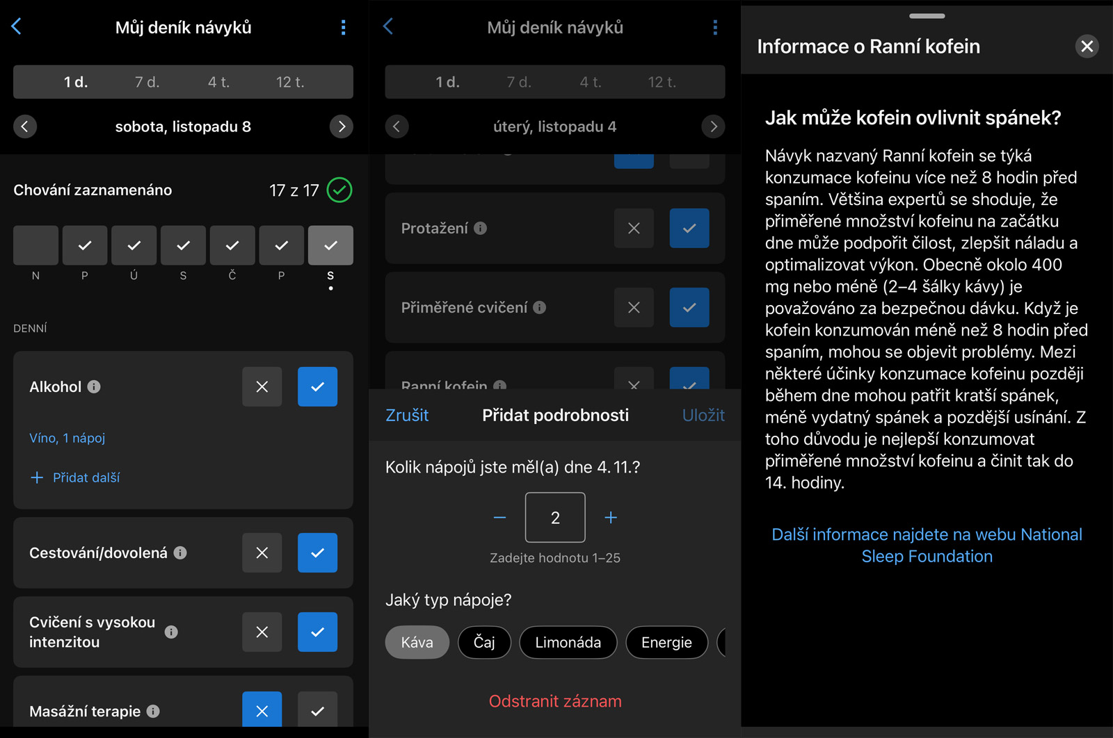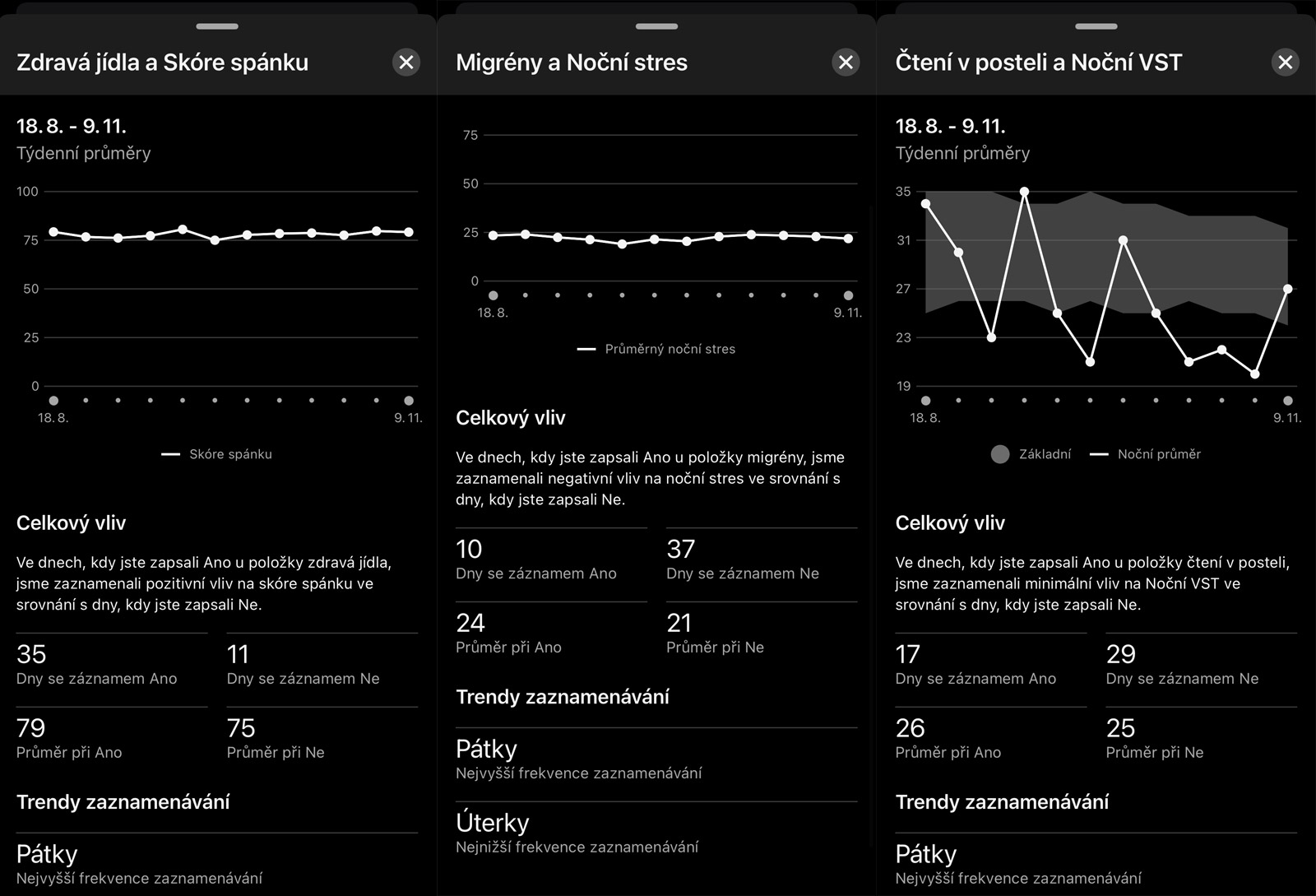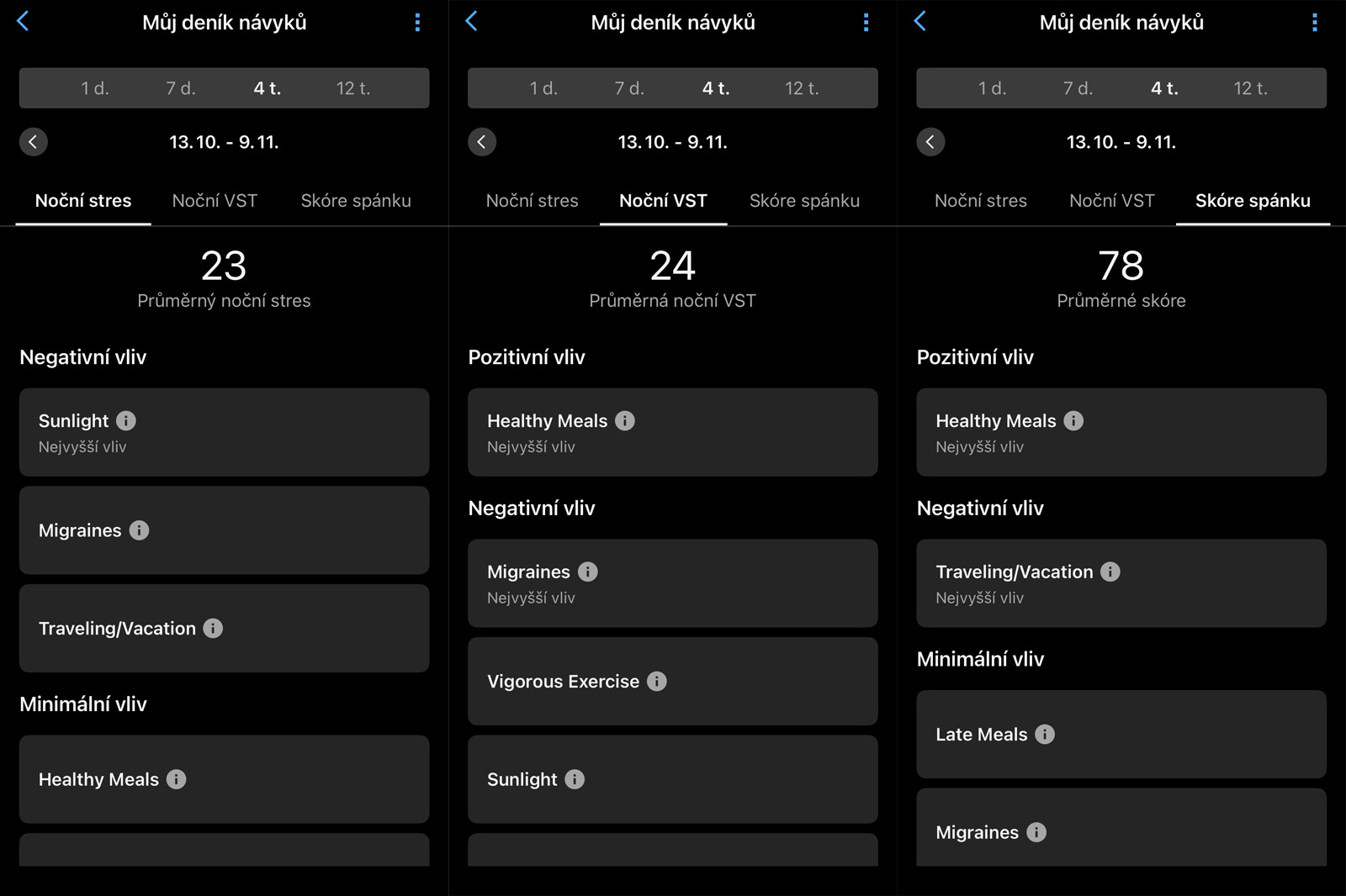 Ale obecně mi Můj deník návyků nepřijde (zatím) nějak zvlášť užitečný. Když se podívám na měsíční přehledy, kde se ukážou pozitivní a negativní vlivy návyků pro stres, noční VST a spánek, tak se vlastně nedozvídám nic nového. To, že pozdní jídlo má negativní vliv na spánek, každý tuší, stejně jako pozdní kofein.
