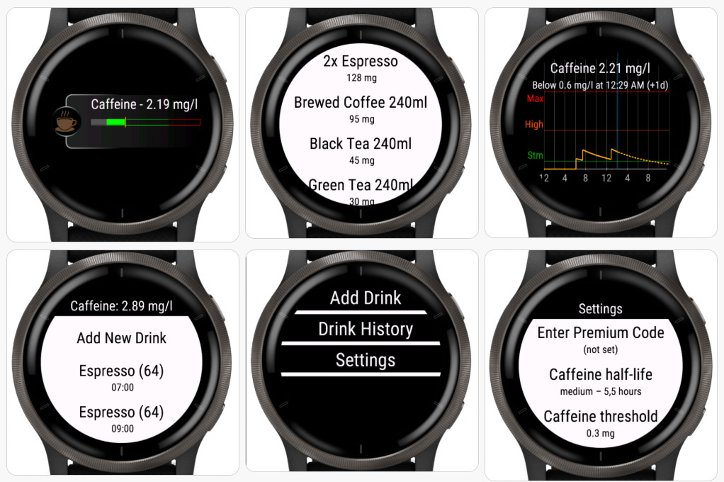 Caffeine Tracker je jednoduchý, ale zároveň velmi zajímavý doplněk pro hodinky z obchodu Connect IQ, který vám pomůže lépe porozumět a kontrolovat příjem kofeinu přímo ze zápěstí. Nápoje můžete zaznamenávat během několika sekund, sledovat odhadovanou hladinu kofeinu v reálném čase a vidět, jak se kofein v těle postupně odbourává.