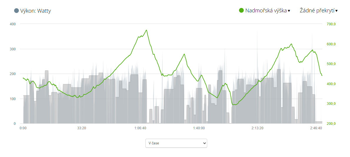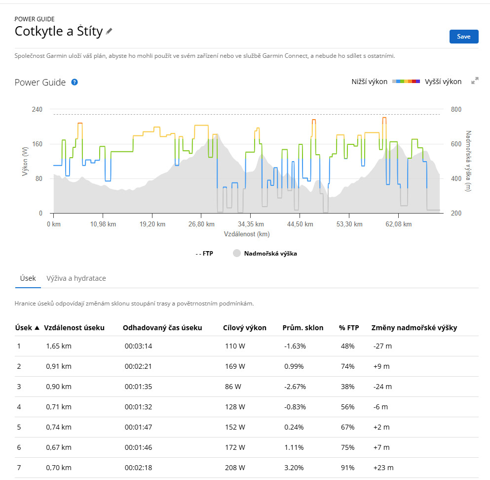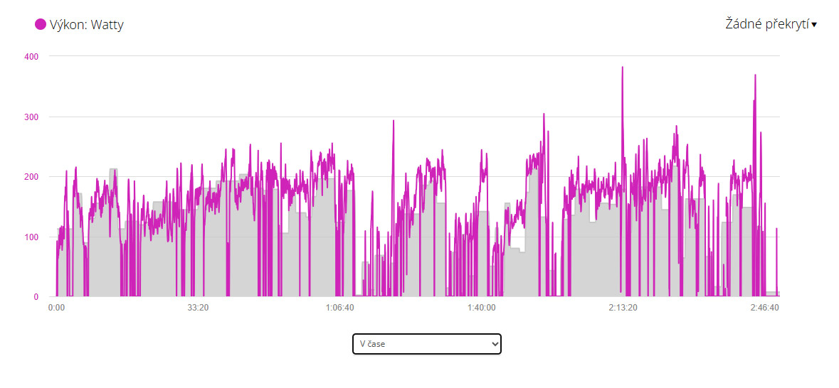 Ale obecně musím říct, že se Power Guide ne úplně trefuje, někdy mi do mírných stoupání dává něco jako 160-180 W, ale já dupu 220-230 W bez nějakých větších problémů (tj. nemám potřebu zpomalovat). Záleží na tom, jak je stoupání dlouhé, čím delší, tím více mi výkon opadává a někdy jsem naopak pod doporučeným průměrem, protože výkon klesá a roste akorát tepovka.