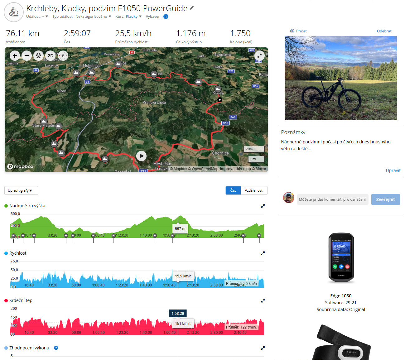 Celá obrazovka Power Guide je poskládaná šikovně, absolvoval jsem takto několik tras během podzimních prázdnin a nemusel jsem celou dobu přepínat jinam. Dole jsou dvě datová pole, která si můžete upravit, standardně je zde vzdálenost a nadmořská výška. Když jsem měl na druhé straně řídítek hodinky, nechal jsem tam nadmořskou výšku, posléze jsem si tam ale zapnul tepovku.