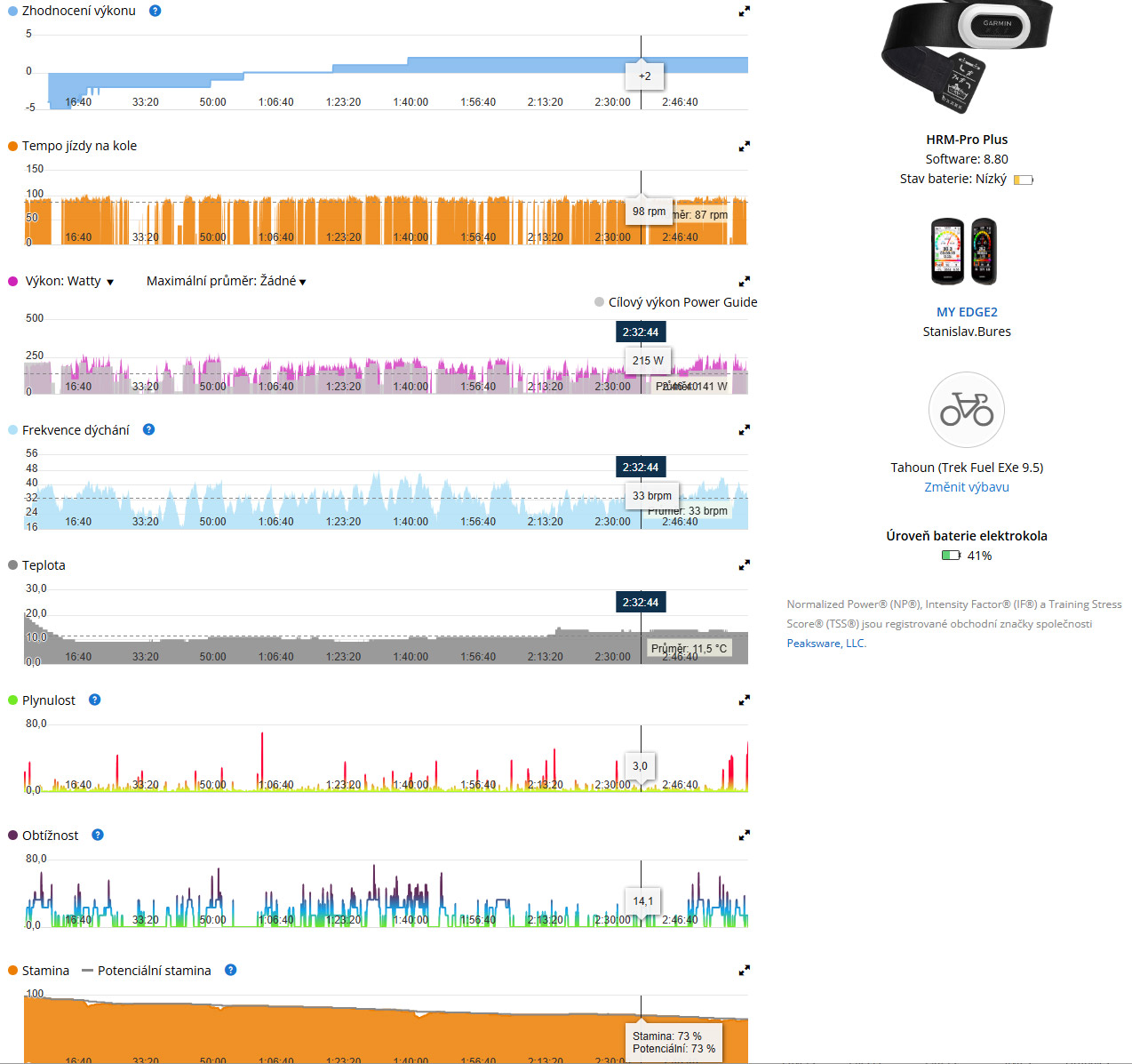 K úpravě FTP dochází po každé aktivitě, pokud to máte nastavené, případně si FTP můžete upravit sami. Já mám zapnutou automatiku a FTP mi kolísá někde mezi 220 a 230 W. Snímač výkonu mám v kole Trek Fuel EXe s motorem TQ HPR-50, kde mám nastavené tři úrovně max. výkonu - 90, 150 a 210 W (a tomu odpovídající 80, 100 a 120 % asistence). Nejčastěji používám první dvě úrovně, v náročnějším terénu a při stoupání přes 10 % zapínám i trojku.