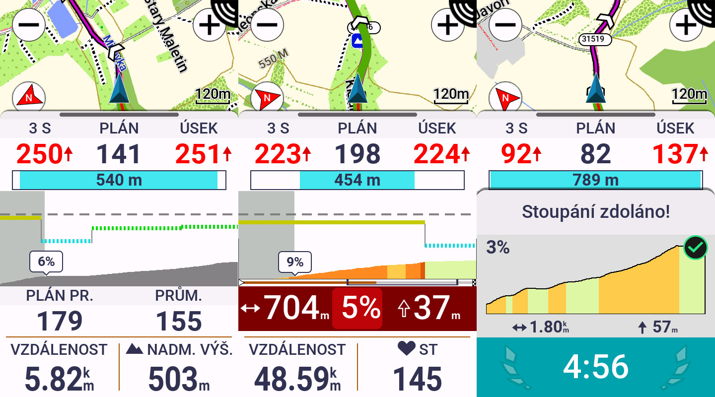 Edge 850 (a další menší modely) mají hodně maličký displej (ale stále je to lepší jak hodinky), takže je to trošku stísněné a naňahňané, ale dá se to. Pokud je aktivní stoupání, v prostoru, kde se ukazuje plánovaný a průměrný výkon na celé trase, se ukáže stručné ClimbPro. Tam uvidíte zbývající vzdálenost, průměrné stoupání v procentech a zbývající vzdálenost.