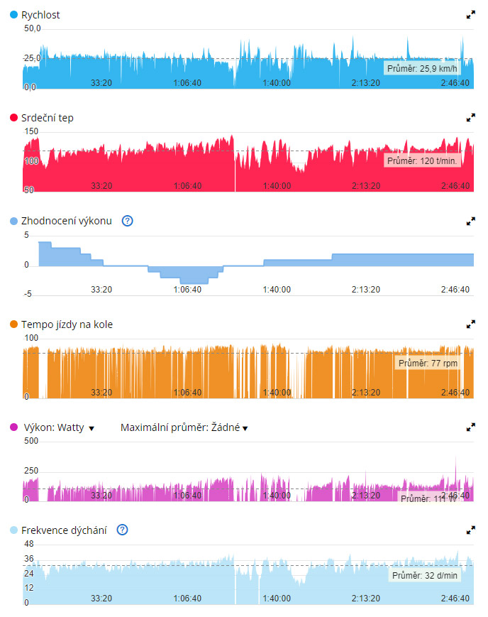 Výkon je navíc instantní, zatímco tepovka má někdy celkem velké zpoždění. Začnu makat pod kopcem, zaberu, výkon okamžitě vzroste, ale tepovce to trvá. A naopak, na kopci už je výkon dávno dole (šlapu výrazně s menší intenzitou), ale tepovka má velkou setrvačnost. Někdy mám navíc tepovku v aktivitě nižší při stejné zátěž, jindy trochu vyšší – výkon je ale stále stejný, stabilní.