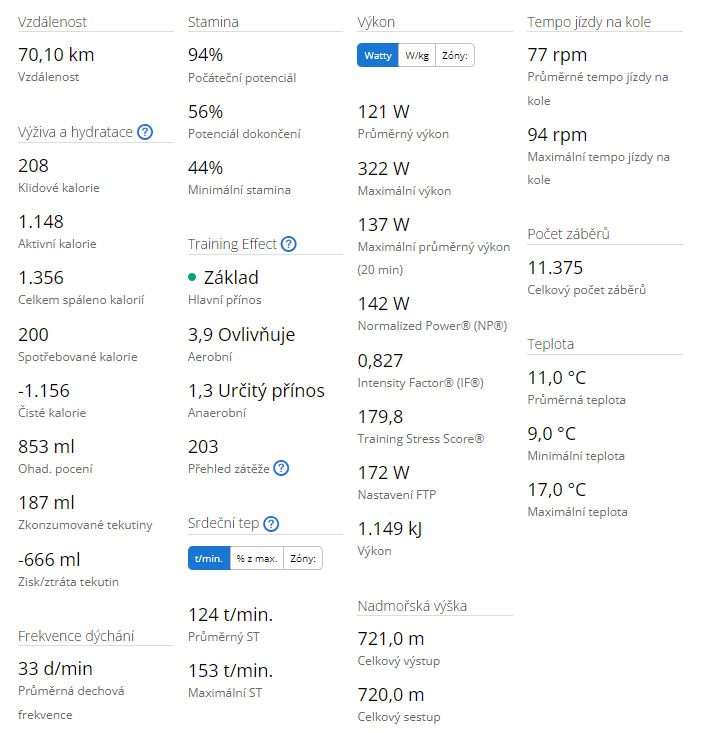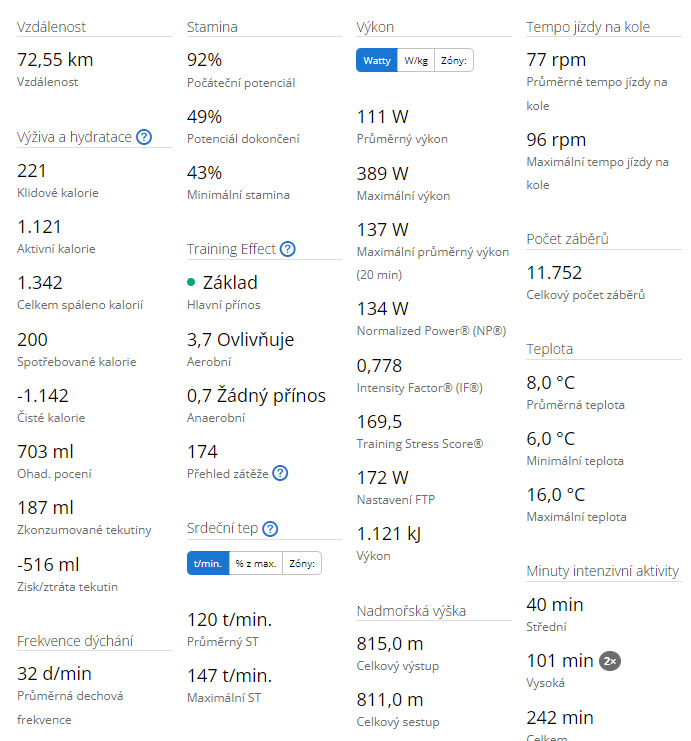 Když se po jízdě podíváte do záznamu aktivity, kromě grafu s výkonem a zhodnocení výkonu najdete řadu údajů v textové sekci Statistiky – Výkon. Kromě průměrného a maximálního výkonu, maximálního průměrného výkonu během 20 minut a FTP jsou tu i další zajímavé údaje, které s výkonem souvisí. Tyto metriky si můžete zobrazit i během jízdy jako datová pole; mě jako hobíka až tak nezajímají, ale pokud na kole fakt trénujete, tak se to může hodit.