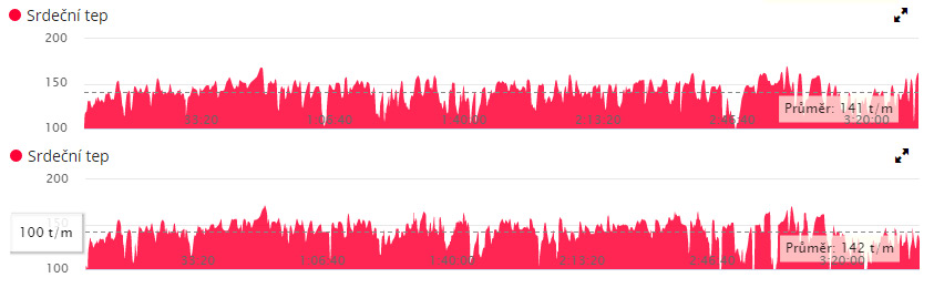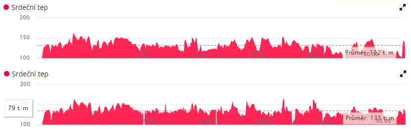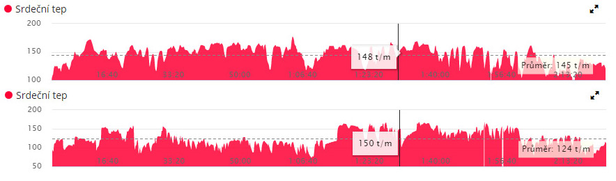 Dobře je to vidět na propadech na přiložených srovnáních; dole je vždy Fénix 5X a jsou zde jasně vidět jednak jiné průběhy tepu a jednak se občas objeví díry. Průměrný tep ale je v podstatě totožný. Trochu odlišné to bylo v této jízdě, kdy se průměrný tep při jízdě trvající 2:20 min lišil o nemalých 21 tepů za minutu. Závěr je jasný: hrudní pás, nebo alespoň externí optický snímač na paži, který by měl být přesnější (a ten jsem ještě netestoval).