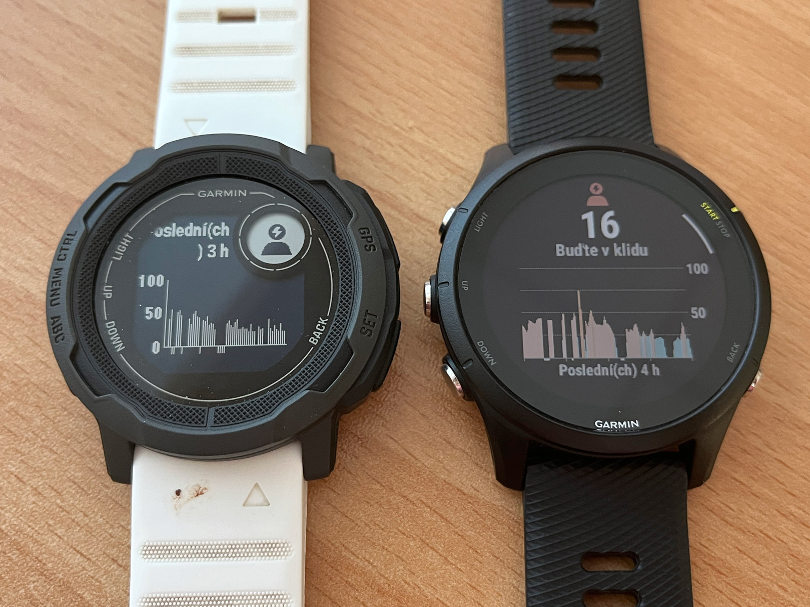 Kde ale Insticty naprosto jasně vedou, to je výdrž. Deklarovaná v pohotovosti je 28 dnů, zatímco u Forerunnerů „jen“ 14 dnů. I to je samozřejmě dost, ale o polovinu méně než u Instinctů. Zde se hodně projevuje menší a úspornější displej, stejně jako pomalejší hardware. Po plném nabití Forerunnery ukážou odhad 14 dnů (nastavení 20 % jasu během celého dne), Instincty pak 30 dnů (nastavení 20 % jasu, ale jen po západu slunce). Po prvním dnu bez aktivity ukázaly FR 255 jen 91 %, zatímco Instincty 95 %.