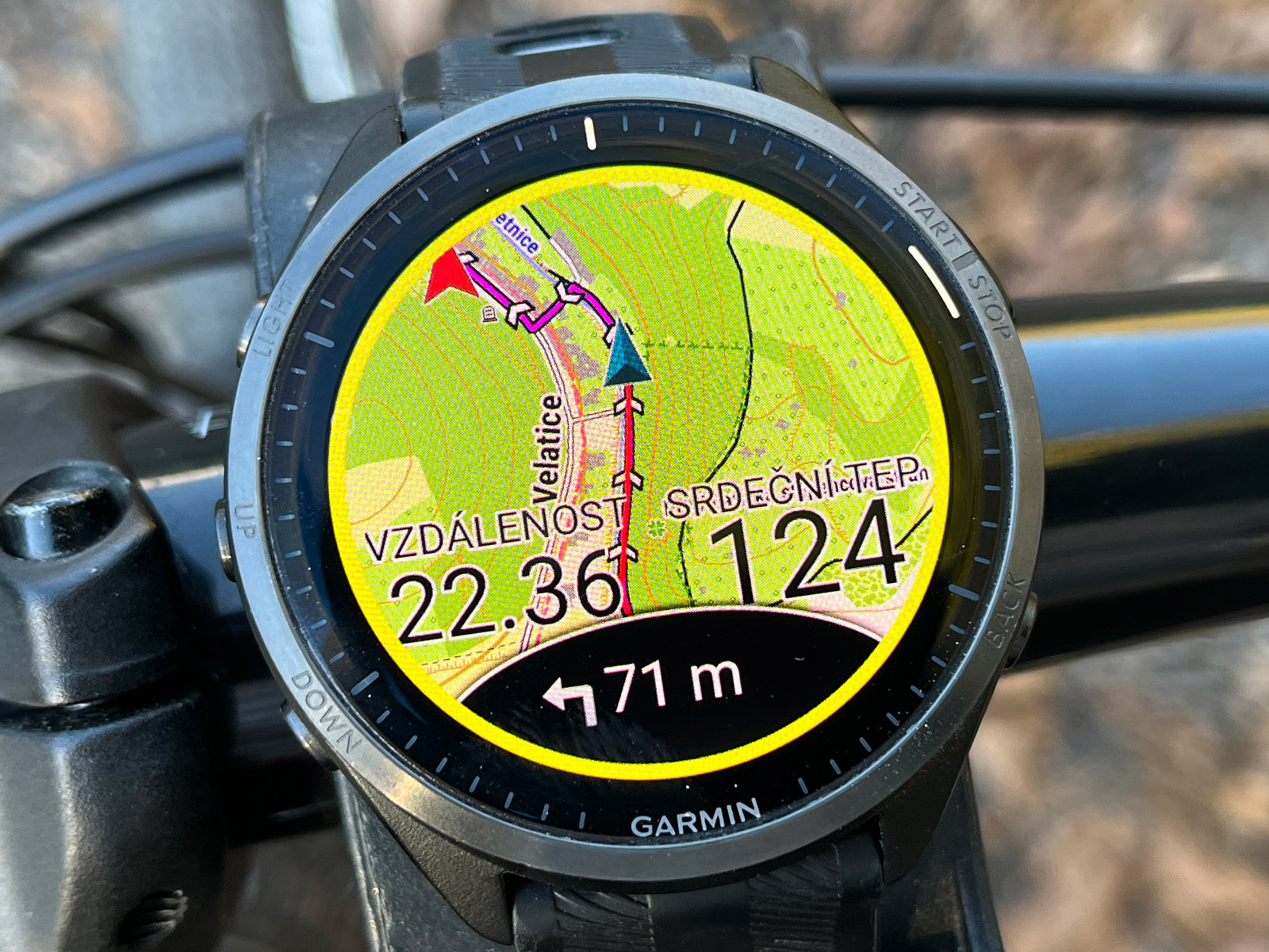 Jenže oproti Epixům jsou tato dvě datová pole hodně velká a šipka s pozicí se tak ukazuje až na datovými poli - a tedy v horní části displeje. Epixy přitom šipku s pozicí ukazují právě mezi datovými poli a tudíž vidíte daleko větší část cesty před sebou. Pokud chcete mít šipku hezky dole, je nutno datová pole vypnout. Toto považuji za podstatnou chybu, vadí to především při navigaci.