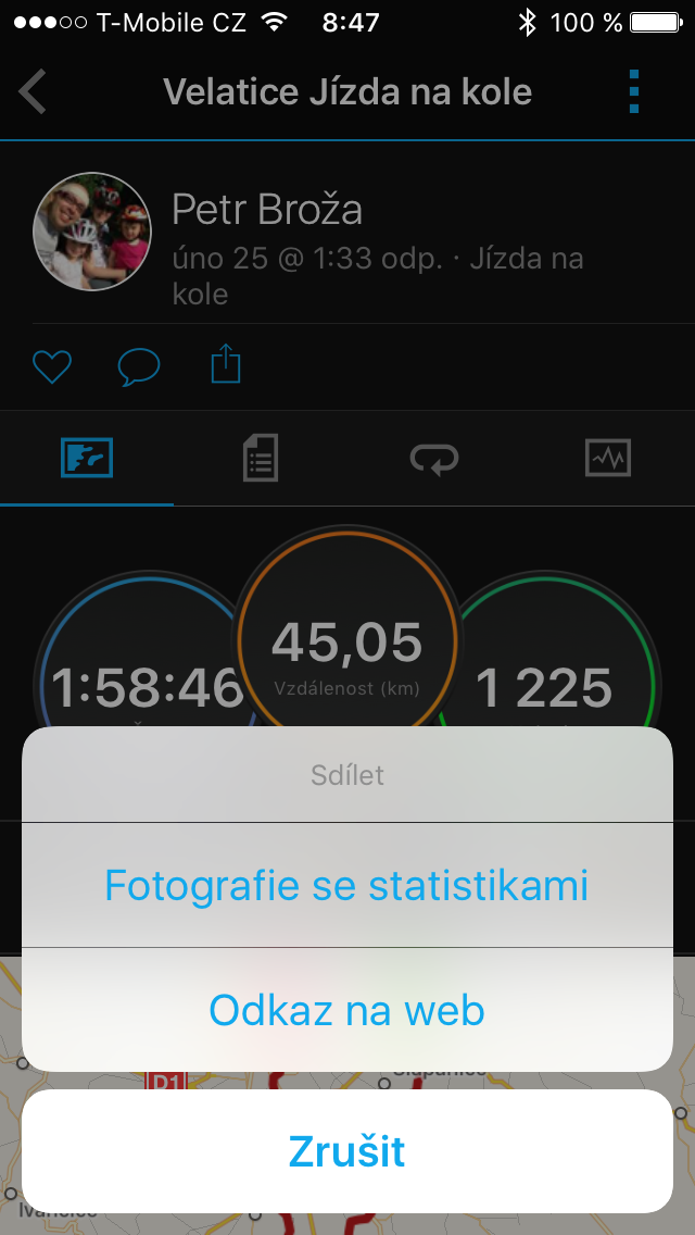 Nyní Garmin přichází alespoň s malou náplastí: můžete sdílet svou aktivitu a místo zobrazení mapy s průběhem aktivity se ukáže vám vybraná fotka. A nemusí být pořízená jen v průběhu aktivity, ale může jít o jakoukoliv fotku, kterou máte uloženou v mobilu.