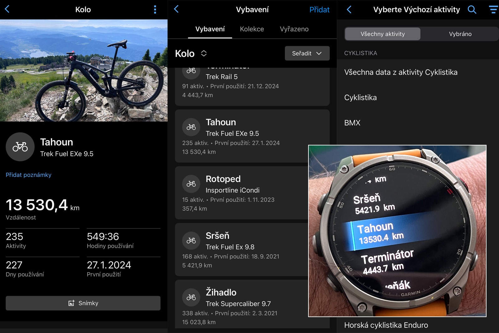 S aktualizací softwaru pro Q1 2026 Garmin tento systém rozšiřuje — přidává větší databázi vybavení a hlavně možnost vybavení přiřazovat a měnit přímo v hodinkách. Což by se mohlo líbit především tě, co neradi editují aktivitu po uložení v Connectu. Já si na to zvykl, ale je fakt, že občas kolo k aktivitě nepřidám a pak mám špatně statistiky.