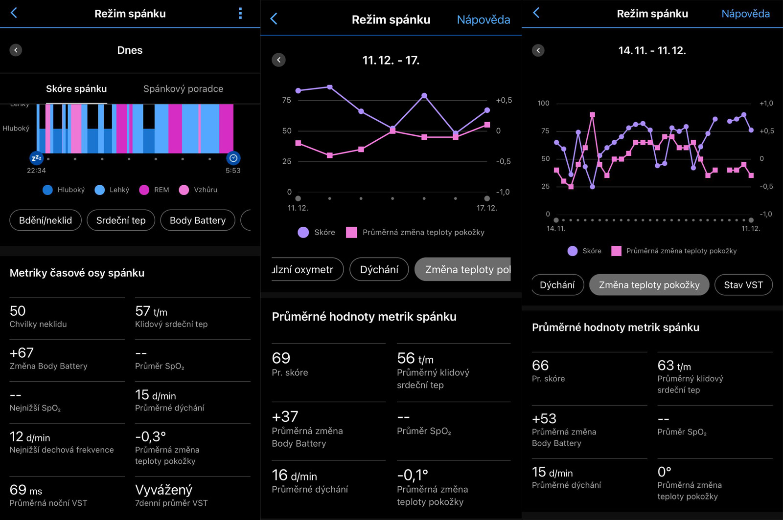 Poznámka: Garmin uvádí, že výchozí hodnoty teplotních dat nastavuje 20 dní zpětně, takže pokud začnete spát v místě, kde je chladněji nebo tepleji, bude trvat zhruba tři týdny, než se upraví základní hodnota. Je to podobné jako u noční VST, kde se při změně naměřených hodnot také optimum po delší době upraví.