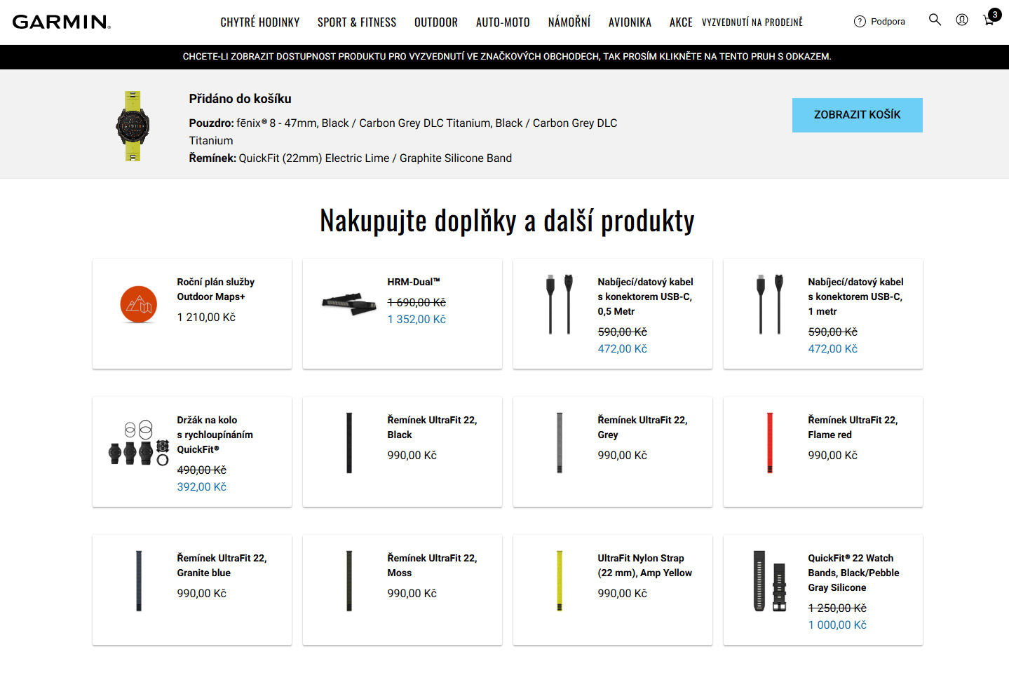 A jde se platitVybrané hodinky se zvoleným řemínkem se objeví v košíku. Někdy ale Garmin zahlásí, že danou kombinaci si nemůžete pořídit, což by mohl vědět ještě před tím, než hodinky vložíte do košíku