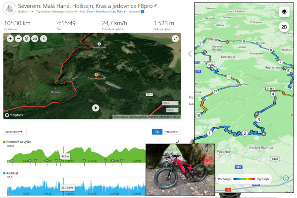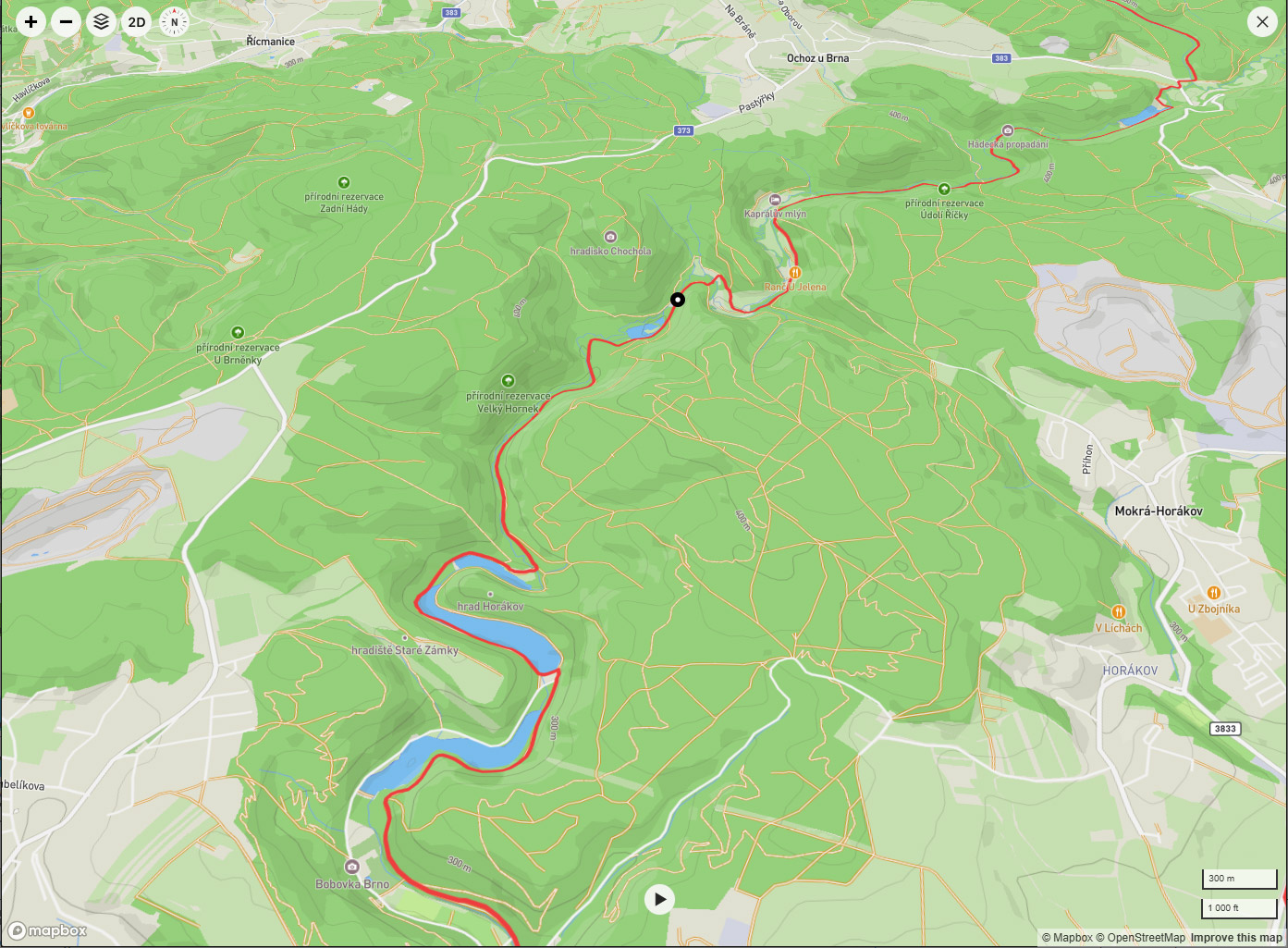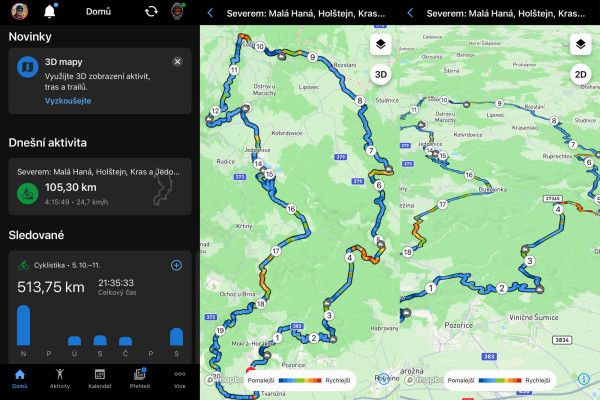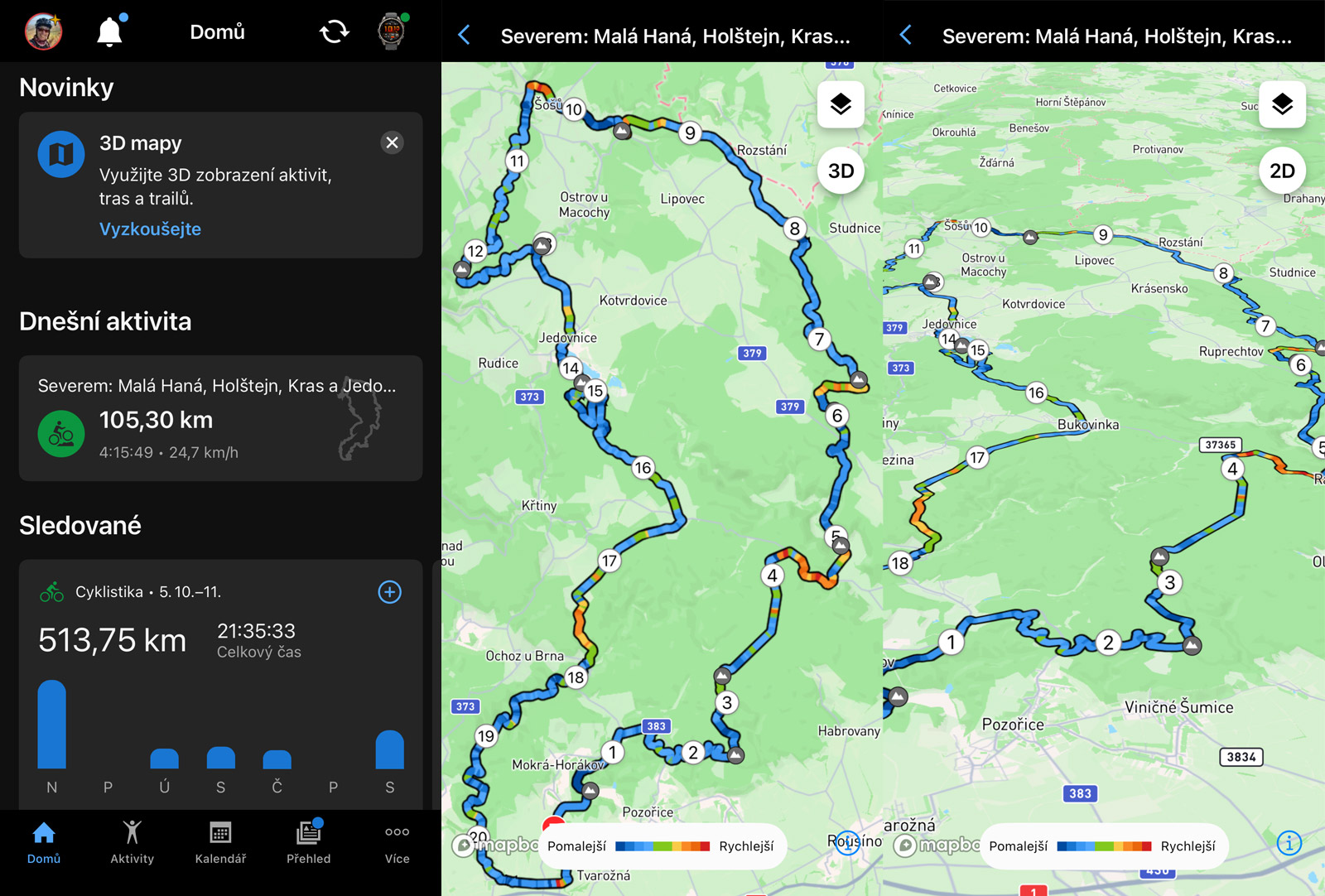 Kdykoliv se přepnete na 3D pohled, otočí se mapa na jinou stranu než na sever, a navíc pokaždé jinak. V některé aktivitě na východ, někdy na jihovýchod, jinak na západ atd. Nějakou logiku jsem v tom nepostřehl. Mapu si ve 3D nemůžete otáčet, maximálně ji vrátit severem nahoru. 3D funguje jak ve webovem Connect, tak v mobilním.