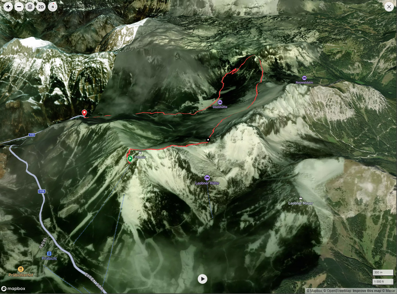 Satelitní AlpyTady už je to krapítek lepší, opravdu lze říct, že koukám na 3D zobrazení krajiny. Toto konkrétně byl výšlap na jeden z kopečků s převýšením 1 200 m oproti údolí