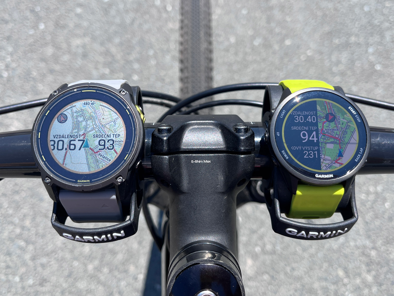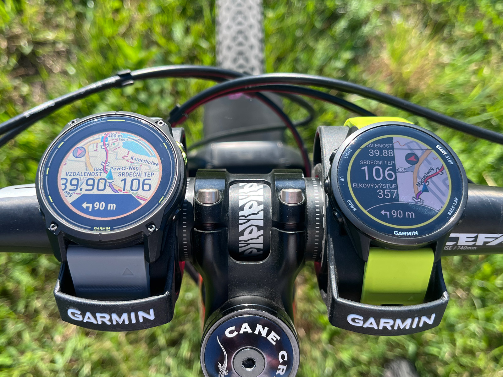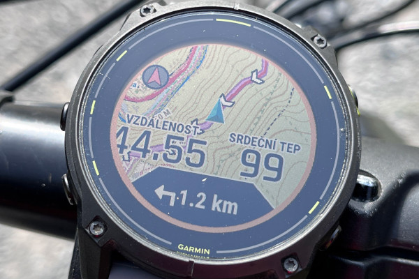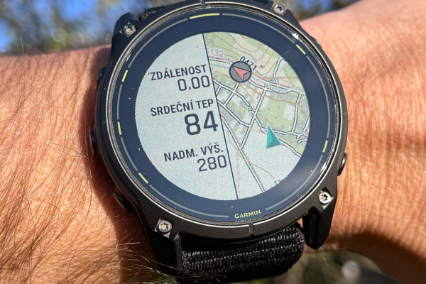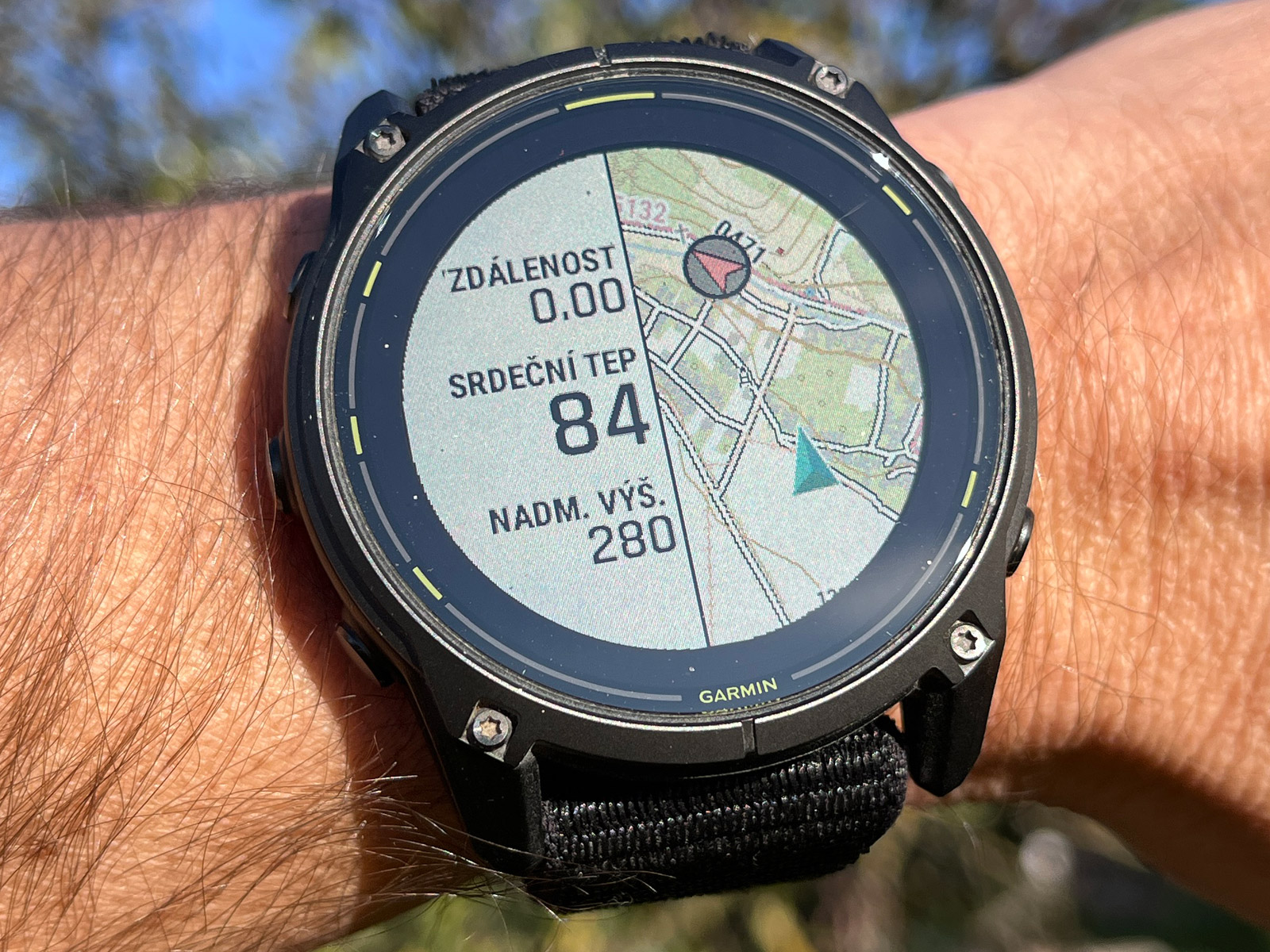 A Garmin, místo aby to vyřešil zmenšením fontu, nechal šipku s pozicí ustřelit nahoru, do první poloviny displeje. Pod daty je navíc hromada místa, kde jsou sice navigační instrukce, pokud je navigace aktivní, ale ze srovnání FR 970 a Epixů je vidět, že prostoru pro ně je tu zbytečně moc. Epixy jsou daleko úspornější a díky tomu je šipka hezky dole. A to i při navigaci, kdy se pouze posune trošku výš.