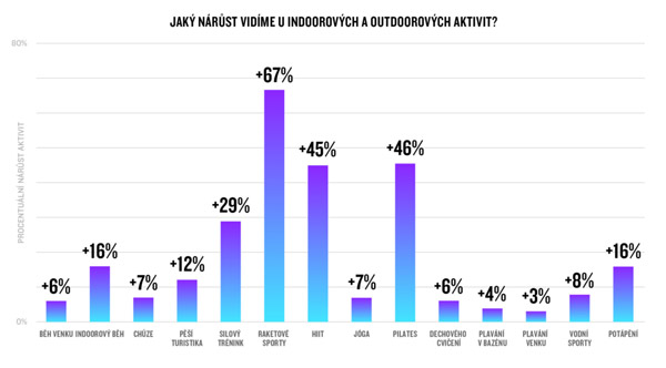 Druhý největší růst (po raketových sportech) letos zaznamenaly aktivity pilates a intenzivního intervalového tréninku HIIT. (Pokud byste potřebovali připravit trénink HIIT, rádi vám pomůžeme.) Počet aktivit potápění vzrostl o 16 % a objem chůze a jógy se zvedl o 7 %.