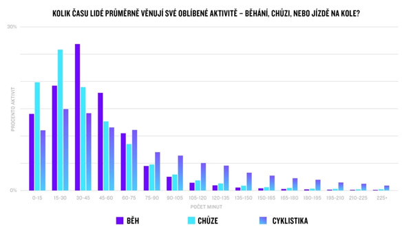 Majitelé hodinek Garmin stráví jednou aktivitou přibližně 55 minut času. Pojďme se podrobněji podívat na běh, chůzi a cyklistiku. Víc než čtvrtina běžeckých tréninků má průměrnou délku 30–45 minut. Procházky pak obvykle trvají 15–30 minut. Téměř polovina cyklistických aktivit je delších než hodina – je nám jasné, že kolo je trochu časově náročný koníček.