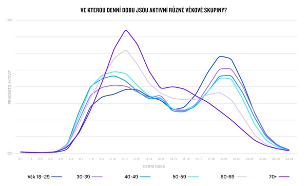 Starší lidé sportovali většinou dopoledne, kdežto mladší měli na pohyb čas spíš odpoledne a k večeru. Uživatelé starší 70 let například obvykle začínali s aktivitou mezi osmou a desátou ráno, kdežto lidé ve věku 18–29 let se ke sportu obvykle dostali mezi čtvrtou a sedmou hodinou odpoledne.
