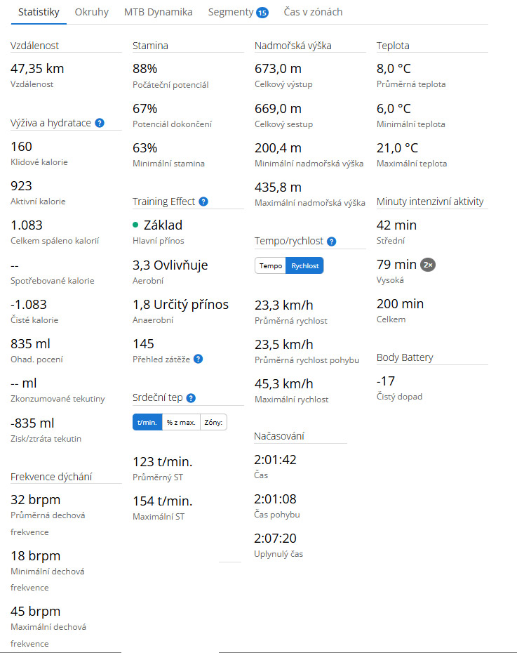 Garmin udává výdrž 15 dnů v režimu hodinek a až 42 dnů s GPS a bez mapy. Já ovšem často jezdím s mapou i navigací, takže mi hodinky často vydrží méně, než udává výrobce. Příkladem budiž aktivita, kdy jsem měl puštěnou navigaci s mapou. Jízda trvala lehce přes tři hodiny a hodinkám ubrala 19 % baterie. To je šest procent za hodinu. A to není málo. Znamenalo by to výdrž okolo 16 hodin. Ale bez mapy a navigace jsem se dostal na tři procenta, což už je přes 33 hodin, a to se údajům výrobce docela blíží.