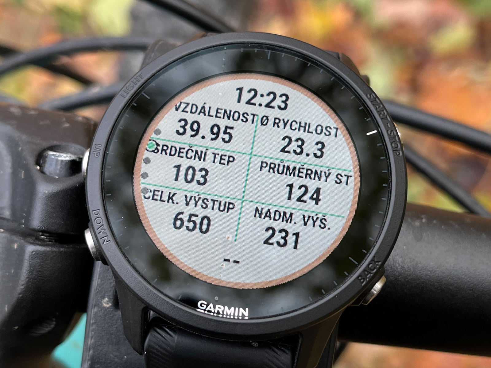 Kdyby tyto hodinky měly displej o velikosti 1,4“ jako FR 965, tak jsou mým jasným favoritem a nedal bych je z ruky. Právě malý displej je trochu diskvalifikuje, data jsou kvůli použitému fontu docela malá – zvlášť, když použijete šest, sedm nebo dokonce osm datových polí. Na druhou stranu díky skvěle čitelnému displeji se parádně orientuji na mapě, a navíc zde není neduh verzí AMOLED, kdy šipka s pozicí uskakuje příliš dopředu a je tak vidět výrazně menší kus trasy před vámi.