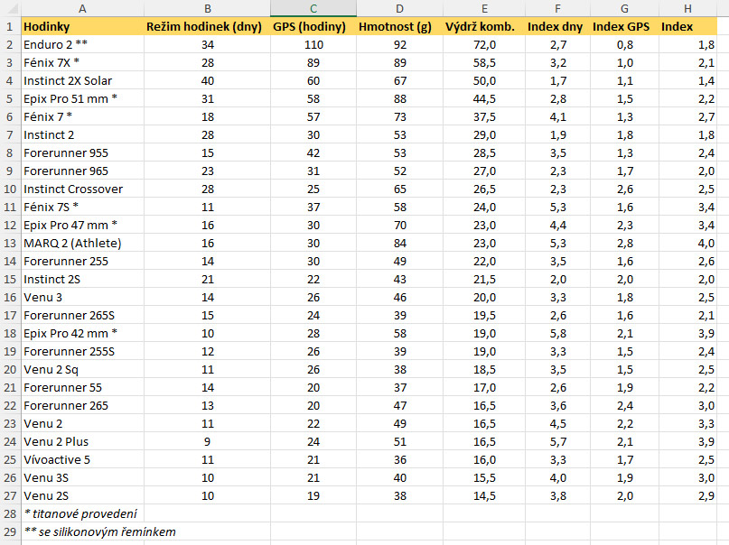 Čili následující seznam hodinek je seřazen podle prostého průměru hodnot výdrže v pohotovosti ve dnech a v aktivitě s GPS v hodinách. Ale ideální to rozhodně není. Podle tohoto seznamu by měly hodinky F7X vydržet déle než I2X, přičemž v mém testu to bylo přesně naopak. Nebo srovnání Epixů Pro 51 mm a F7X Pro - v testu mi o kousek déle vydržely Epixy, ale dle tabulky mají výdrž slabší. Takže to berte fakt jen orientačně...