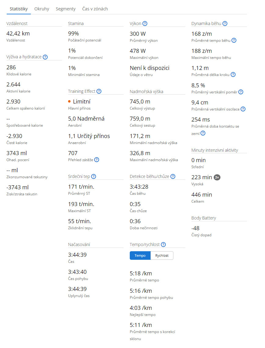 Z přiložených grafů je vidět, že podle hodinek běžci stamina došla někdy na začátku poslední třetiny závodu. Ale to samozřejmě neznamená, že člověk padne vysílením k zemi. Jen to, že hodinky předpokládají horší kondici, než jakou ve skutečnosti máte. Samozřejmě záleží na dobře nastavených zónách tepu apod.