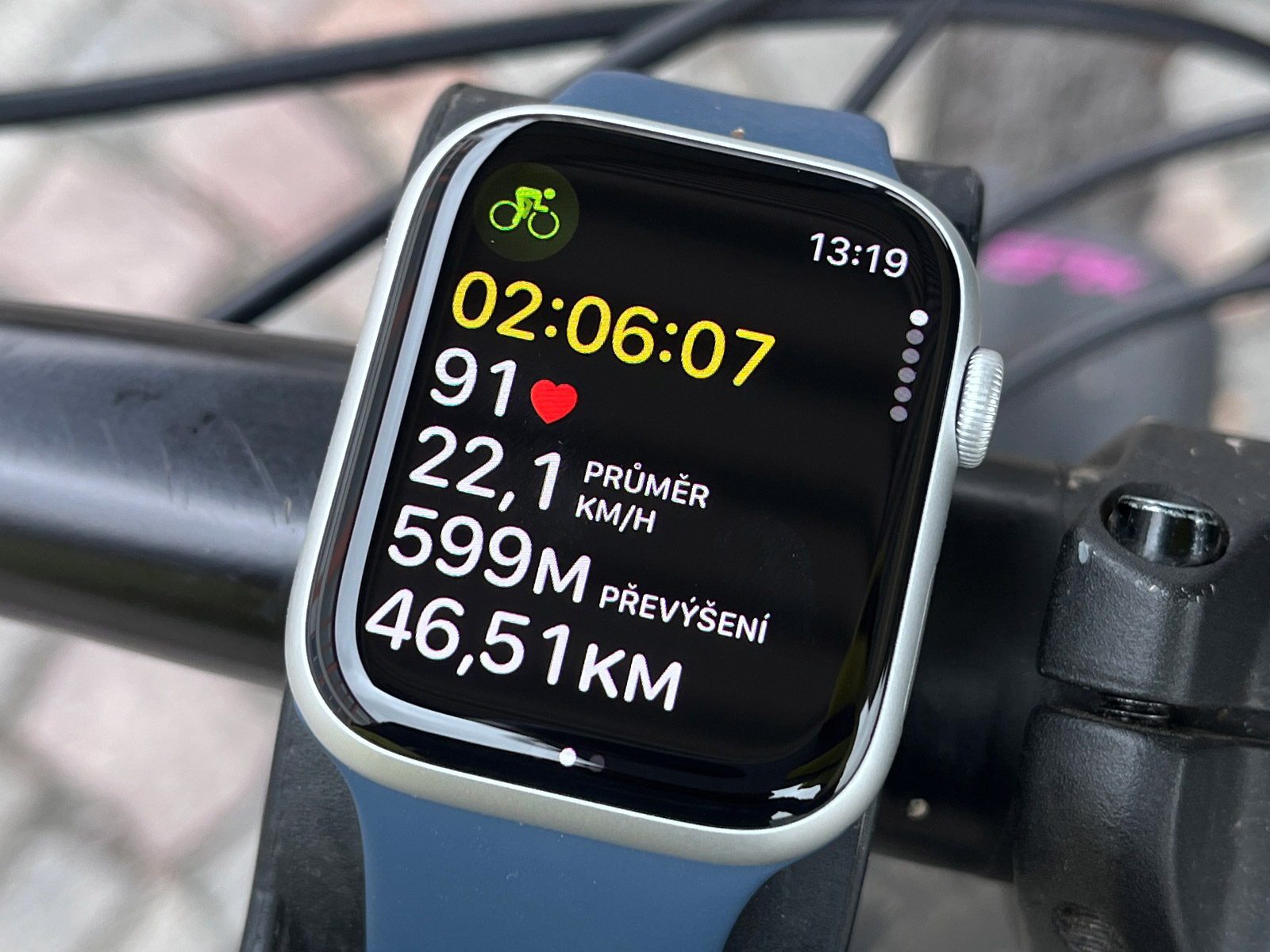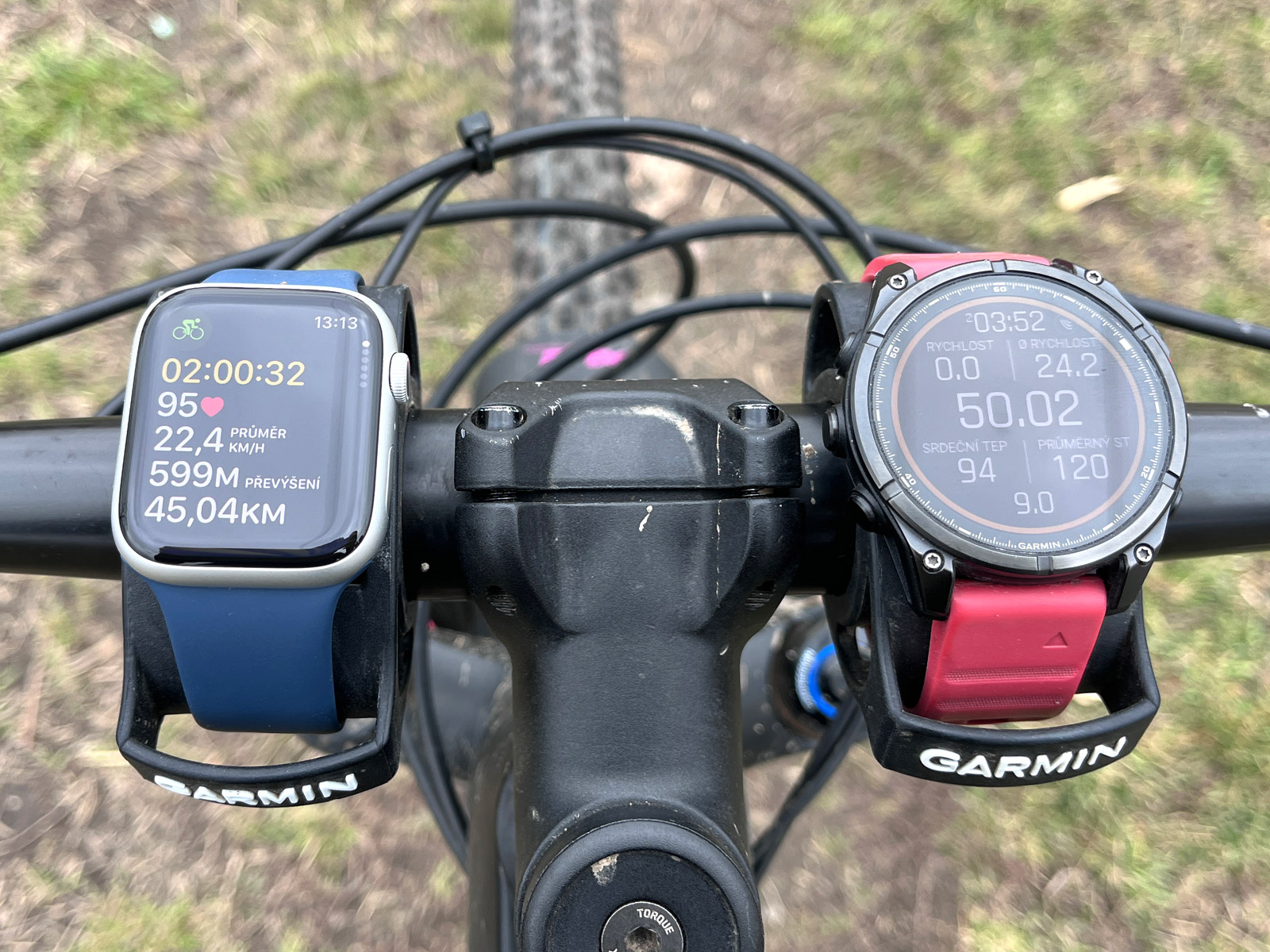Super je jas hodinek. Ten má u AW 9 až 2 000 nitů, tedy dvojnásobek toho, co garminy. A je to fakt znát, na přímém slunci není s čitelností naprosto žádný problém. A přímé srovnání s F8 AMOLED jasně ukazuje, kde má Apple navrch. Když jsem měl hodinky na řídítkách vedle sebe, oboje hodinky v režimu AOD, byla úroveň nízkého jasu na AW stejně vysoká jako režim vysokého jasu na F8. Zkrátka data byla po celou aktivitu vidět naprosto parádně. Jak já bych si toto přál na AMOLED hodinkách Garminu!