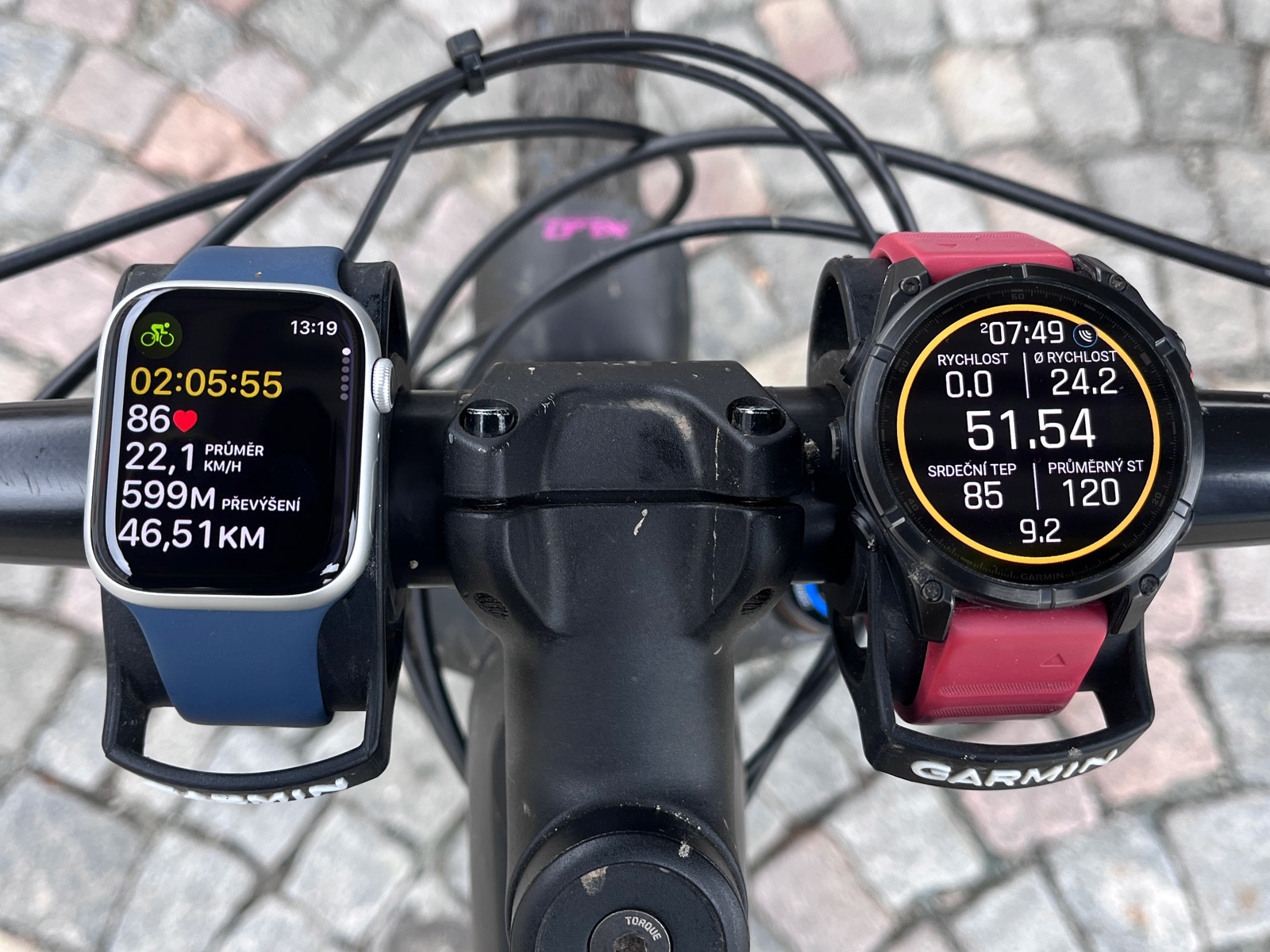 Na data AW jsem tedy celou jízdu neviděl, což je trochu proti tomu, co od sporttesteru očekávám, ale aspoň se mi podařilo zaznamenat nějaká data. Hodinky AW měřily tepovku na zápěstí, Fénixy z hruďáku HRM Pro. Průměrná tepovka byla 134 tp/m, Fénixy pak ukázaly 136 tp/m. Průběh na první pohled vypadal podobně, nějaké zevrubnější zkoumání bude na pořadu dne později. Stále mi ale vrtalo hlavou, jak dostat hodinky na řídítka.