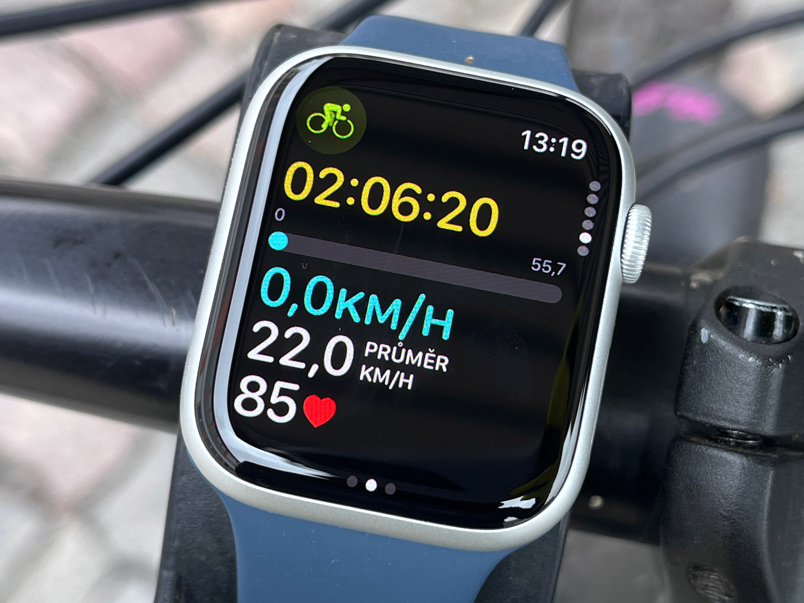 Hodinky jsem umístil na řídítka kola a spustil jízdu. A světe div se, nevypnula se po deseti sekundách jako předtím, ale prostě běžela dál. Jen okamžitě zhasnul displej, protože jsem měl hodinky v režimu vypnutého AOD. A tak jsem ještě v menu zapnul AOD a hele, displej zůstal krásně svítit po celou dobu aktivity. Jakmile jsem pak aktivitu ukončil, vypnul jsem AOD kvůli úspoře displeje a zase zapnul detekci zápěstí, aby mi běžely metriky; zámek hodinek jsem nechal vypnutý.