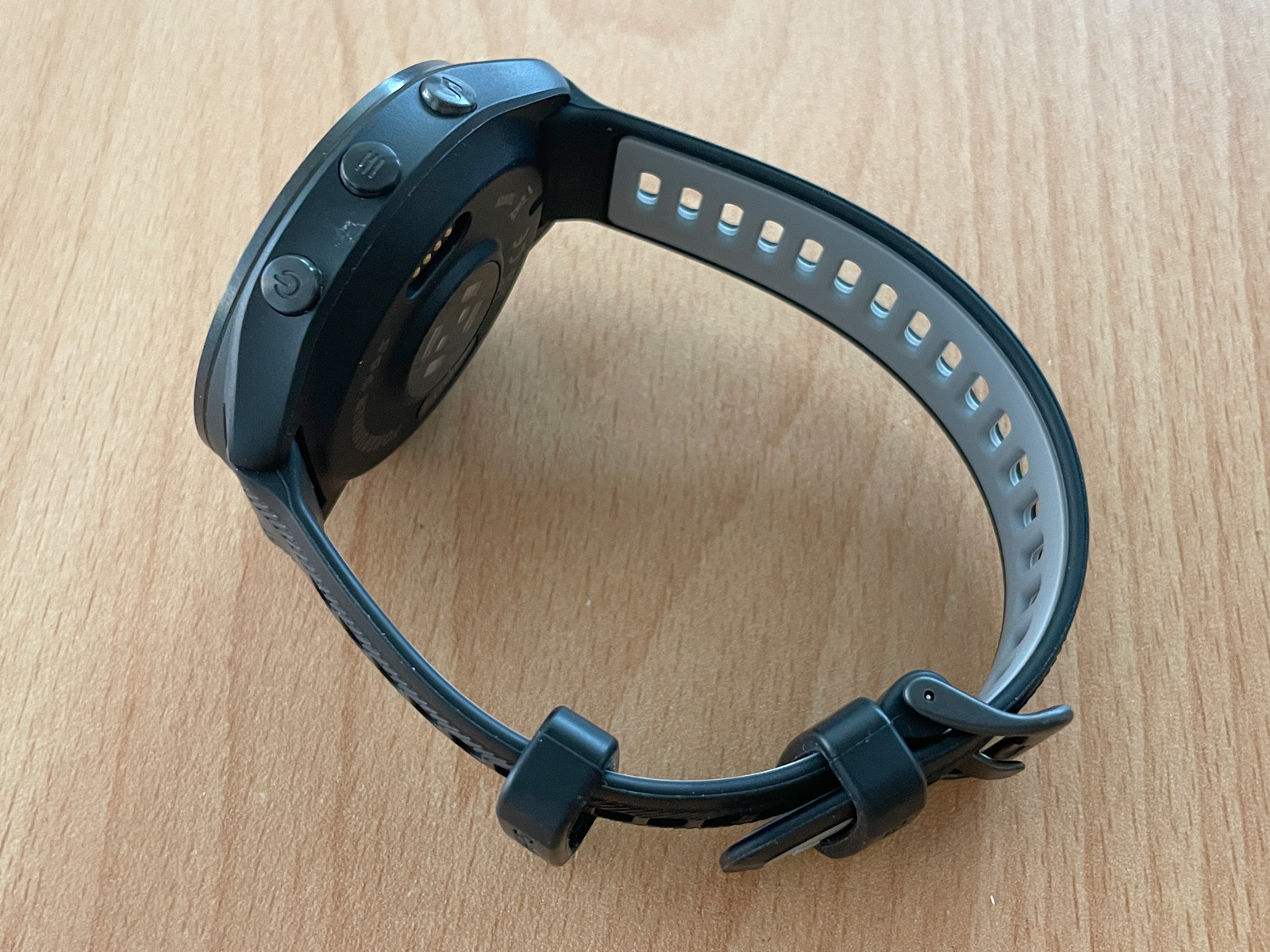 Použitý řemínek je velmi příjemný na ruce a současně pružný, takže i když si jej utáhnete kvůli přesnosti optického snímače při aktivitě, netlačí. To je stejné jako u FR 265. Má dva úchytky, zatímco FR 265 jen jeden. Přebytečný konec tak lépe drží a neplandá tolik jako na FR 265. Původně jsem chtěl variantu s černožlutým řemínkem, ale na tu bych čekal déle – a nutno dodat, že toto provedení působí elegantněji a hodí se ke všemu oblečení.