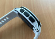 Standardní řemínek nemá systém QuickFit (je s ním ale kompatibilní), ale svůj vlastní. V místě uchycení je výrazně mohutnější a vtočený dolů, takže hodinky nelze položit na stůl narovno – připomíná mi to Forerunnery 45. V místě uchycení je řemínek pevný a nejde s ním hýbat. Nešlo mi tak vyfotit klasické srovnání s Fénixy na stole, ale musel jsem hodinky dát pro tyto účely na zábradlí, což vypadá poněkud divně, ale funguje to. (Posléze jsem ale na řešení přišel, už ale nebyl čas na nové fotky.)