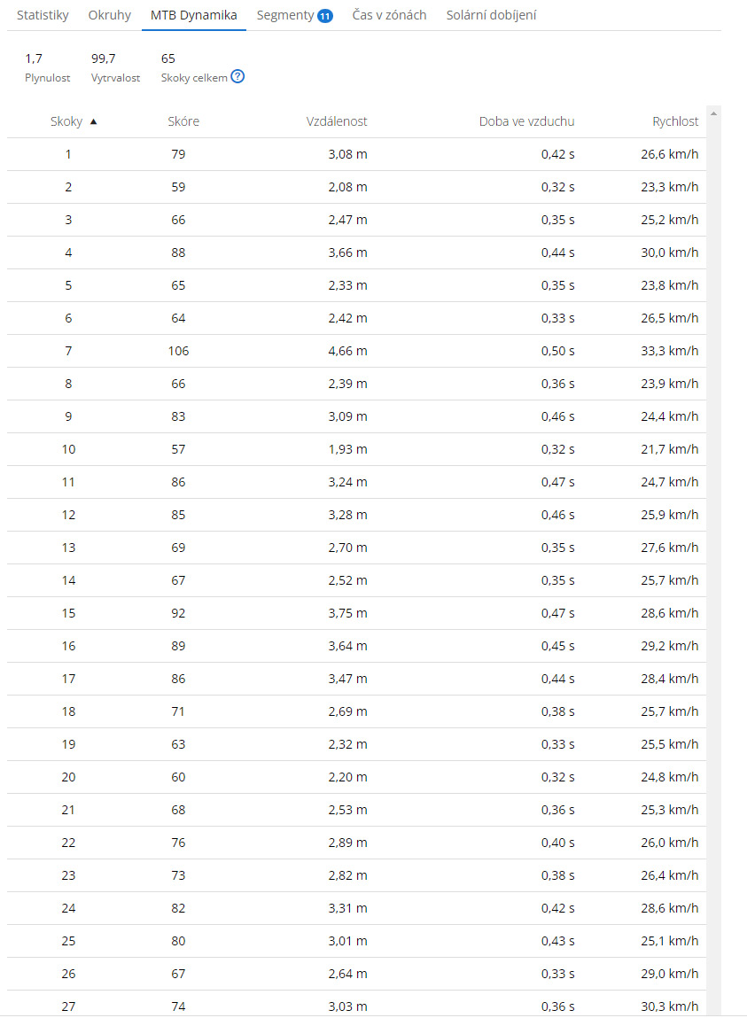 Poslední bajkovou metrikou, kterou dokážou navigace Edge změřit, jsou pak skoky. Kdykoliv se s kolem odlepíte od země, zaznamená navigace skok – a to na základě rychlosti a vestavěnému akcelerometru. U každého skoku určí zařízení nájezdovou rychlost, vzdálenost a dobu každého skoku a na základě těchto metrik generují celkové skóre pro skok. Pokud skok dosáhne určitých parametrů, tuším délku alespoň tři metry, zobrazí se jeho parametry na cca pět sekund přímo na obrazovce navigace s textem „Skvělý skok“. Tuto metriku mám obzvláště rád a je škoda, že na hodinkách chybí.