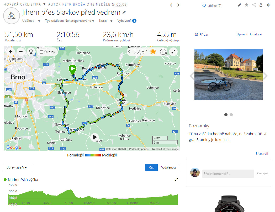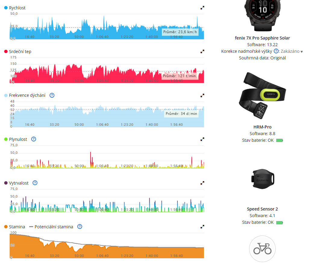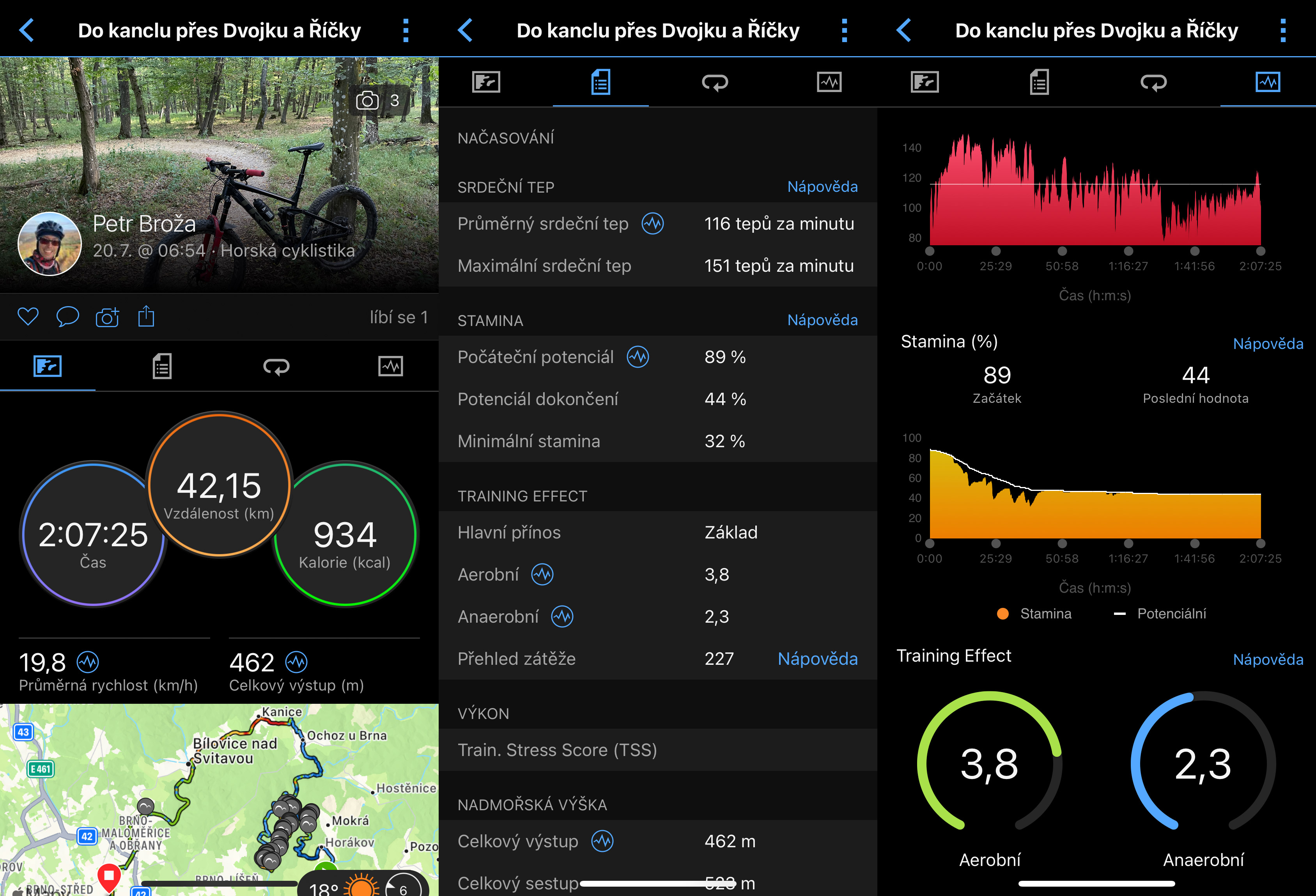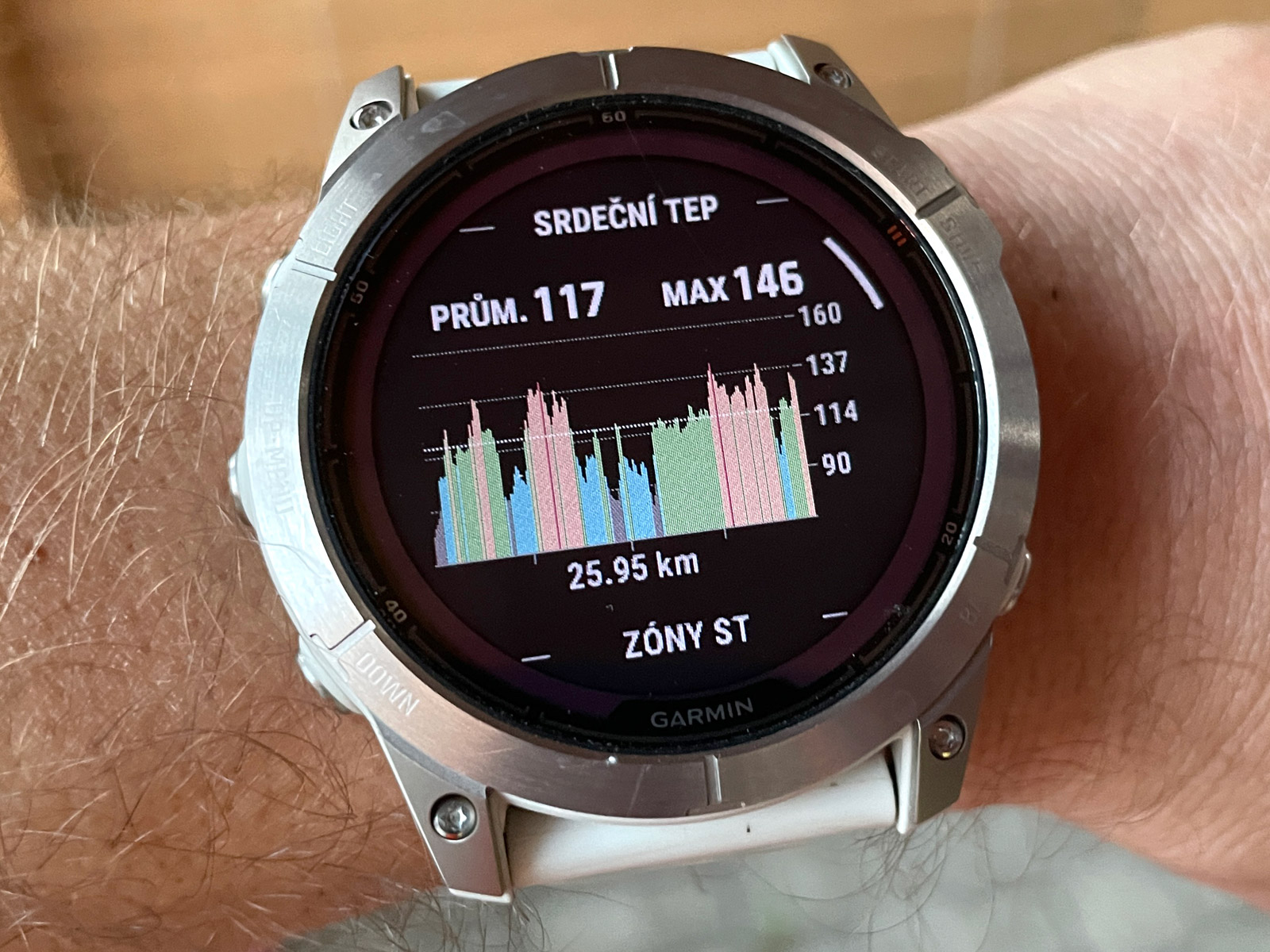 Po základním souhrnu se vzdáleností, rychlostí či tempem a mapou, pokud šlo o outdoor aktivitu, následuje průběh nadmořské výšky, rychlosti/tempa, tepové frekvence, graficky vyjádřené zóny tepu, případně výkonu, tréninkový efekt a zátěž. Nutno říct, že tento přehled je moc povedený a něco podobného mi na Fénix 6X chybí.