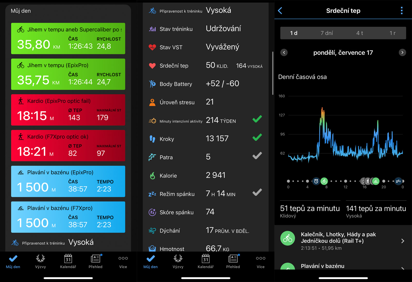 Přijde mi ale, že do Skóre vytrvalosti se započítávají jen aktivity, které mám na hodinkách. Když jsem po více než měsíci používání hodinek na kole přesedlal zpátky na Edge a absolvoval více než tříhodinové a celkem intenzivní jízdy, skóre skokově spadlo o 400 bodů. K tomu dávám kardio, plavání i delší chůze… Tuto metriku budu muset ještě zkoumat, bude to chtít více času na test.