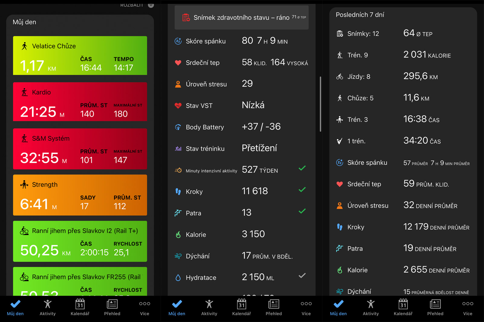 - Stav tréninku – chybí graf dlouhodobé zátěže a poměr zátěže, stejně jako zaměření zátěže