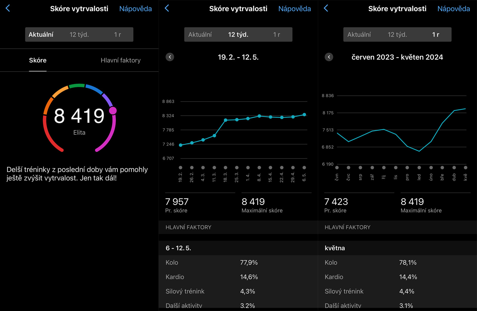 Oba grafy doplňuje přehled typů aktivit, které měly na vytrvalost největší vliv - u mě je to primárně kolo, chůze a kardio. Na záložce s 12týdenním přehledem to jde po týdnech, na záložce s ročním pak po měsících. Vždy je vidět vyjádření v procentech.