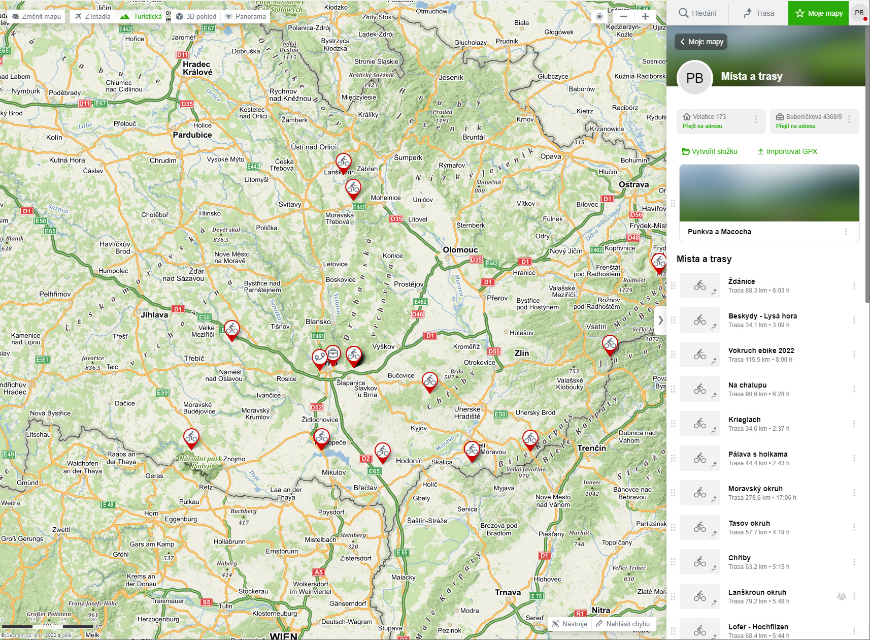 Po importu se zobrazí na mapě průběh trasy a v levé části výškový profil, který se spočítá podle zvolené mapy, délka trasy a celkově vystoupané a sestoupané metry. Trasu si můžete upravit přímo v mapě a pojmenovat. Pak si ji uložíte do seznamu tras tlačítkem Uložit novou trasu.