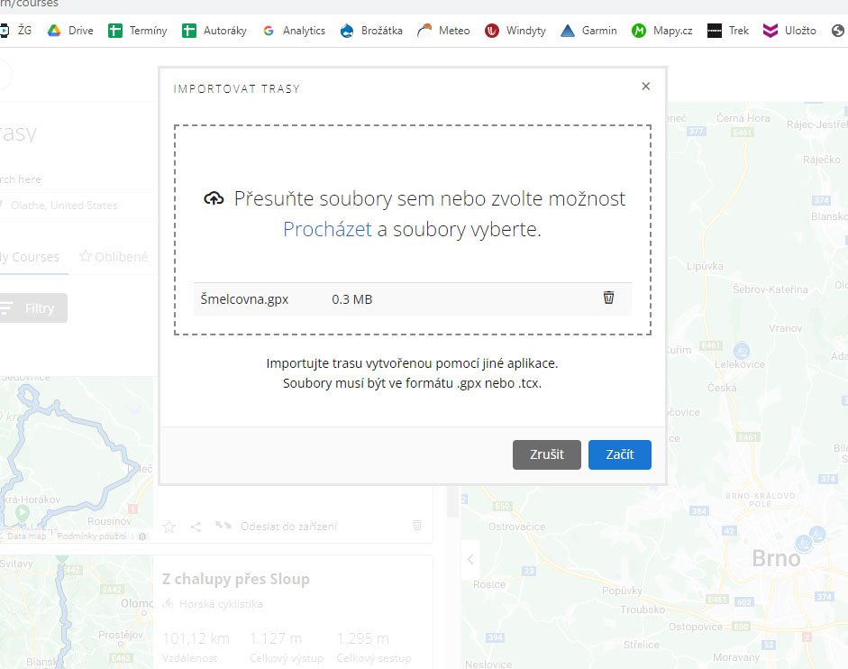 V deníku Connect se pak v levém sloupci přepněte na Trénink/Trasy, zobrazí se seznam již existujících tras a mapa. V horní části nad seznamem tras klepněte na Importovat. Nyní přetáhněte do okna soubor GPX nebo TCX, případně klepnutím otevřete standardní dialog průzkumníka. Klepněte na Začít a zvolte typ trasy - běh, turistika, kolo atd. Po klepnutí na Začít se provede vlastní import.