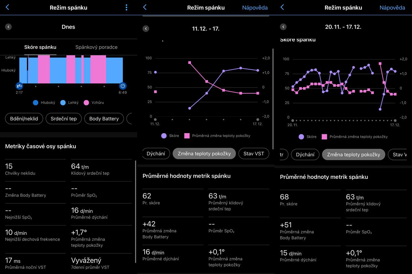 A k těmto metrikám se nedávno přidalo i měření teploty pokožky, které mají všechny hodinky se snímačem páté generace - řada Fénix 7 Pro, Epix Pro, Tactix 7 AMOLED, Quatix 7 Pro, D2 Mach 1 Pro a Venu 3. Poté, co se stanoví vaše základní hodnota, sledují hodinky každou noc odchylku. Nevidíte tak, jaká teplota byla v absolutní hodnotě, ale jen změnu.