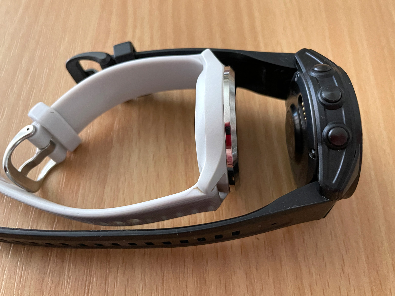 Fénix 7S jsou také velmi lehké, v porovnání s většími Fénix 7 a zejména Fénix 7X. Titanové provedení váží s řemínkem 58 gramů (tělo hodinek 42 gramů), ale oproti V2S je to stále hodně. Ty váží totiž jen 38 gramů, a to je prakticky nic. Prostě o hodinkách na ruce vůbec, ale vůbec nevíte. Fénix 7S přece jen trochu cítit jsou a hlavně větší tloušťka o sobě dává znát zejména při oblékání – neustále se o ně něco zadrhává, i třeba popruhy batohu. Prostě Venu 2S působí více dámsky, zatímco Fénix 7S mají design prostě, no prostě jako Fénixy. Ale díky tomu jsou unisex – mohou je nosit dámy, ale i pánové s menším zápěstím (jako třeba já).