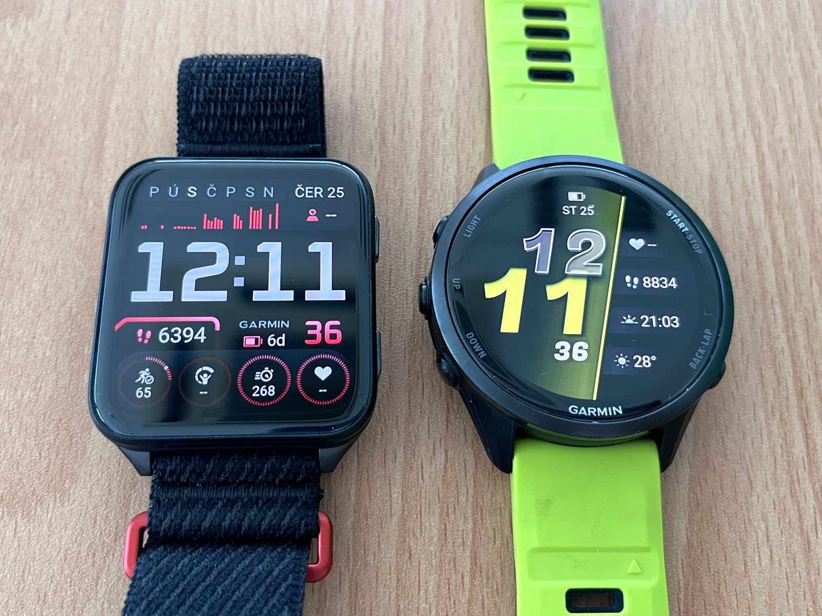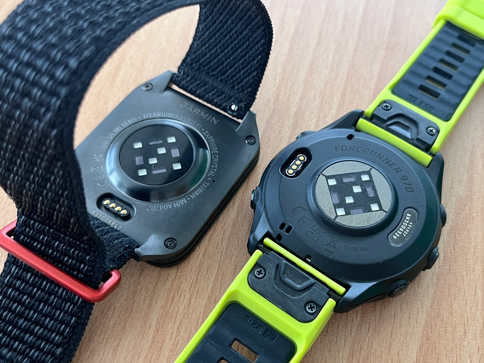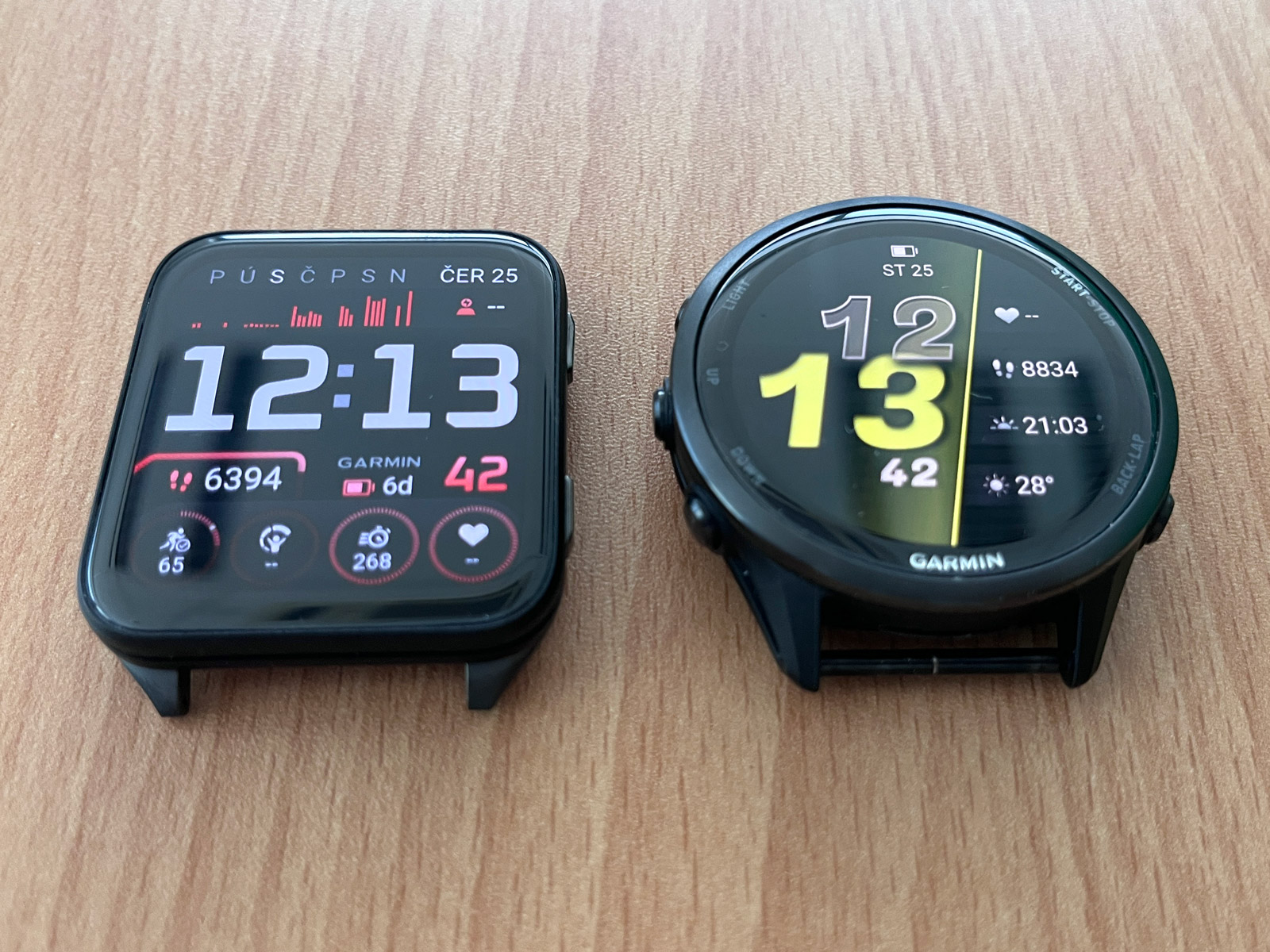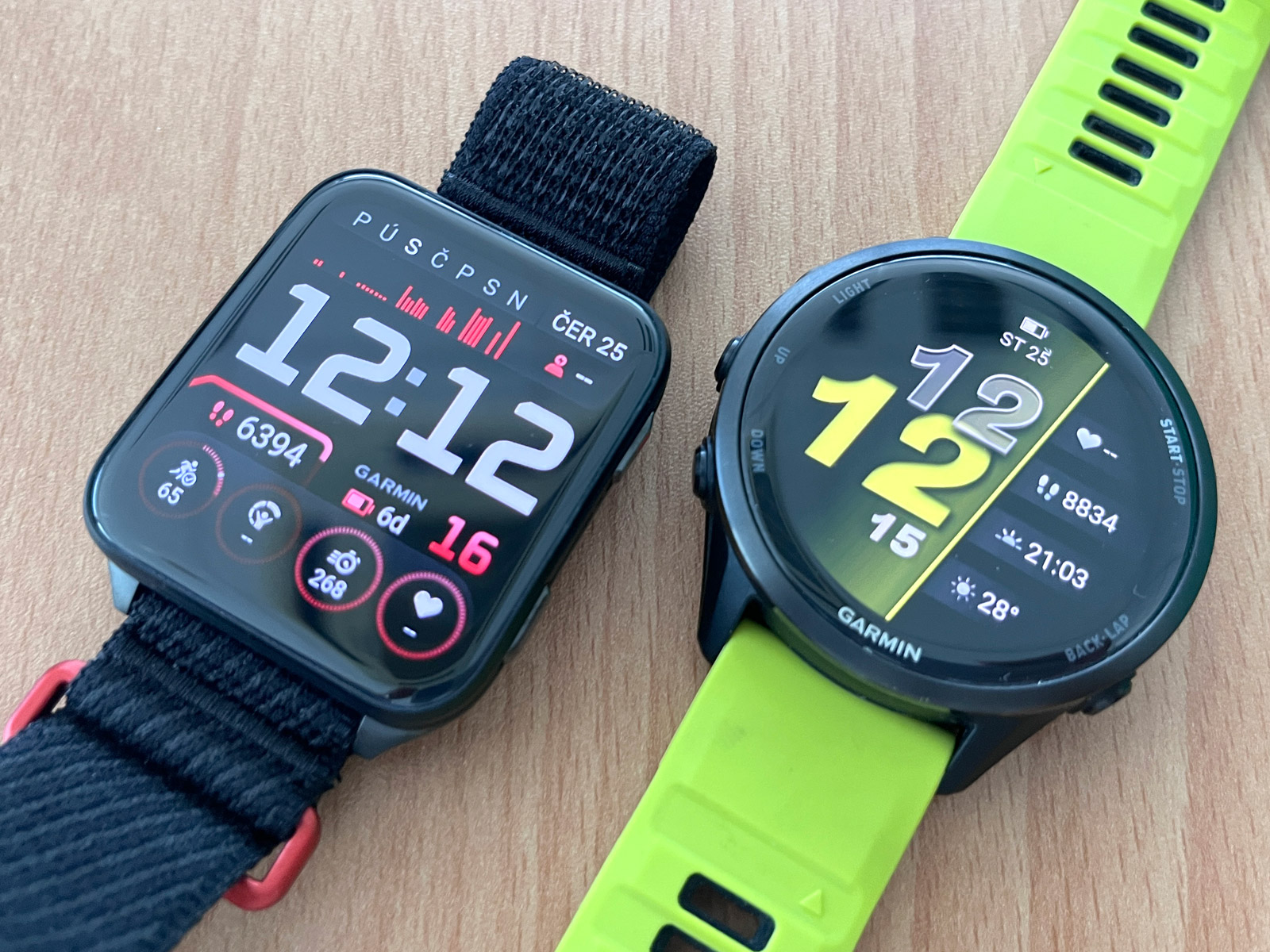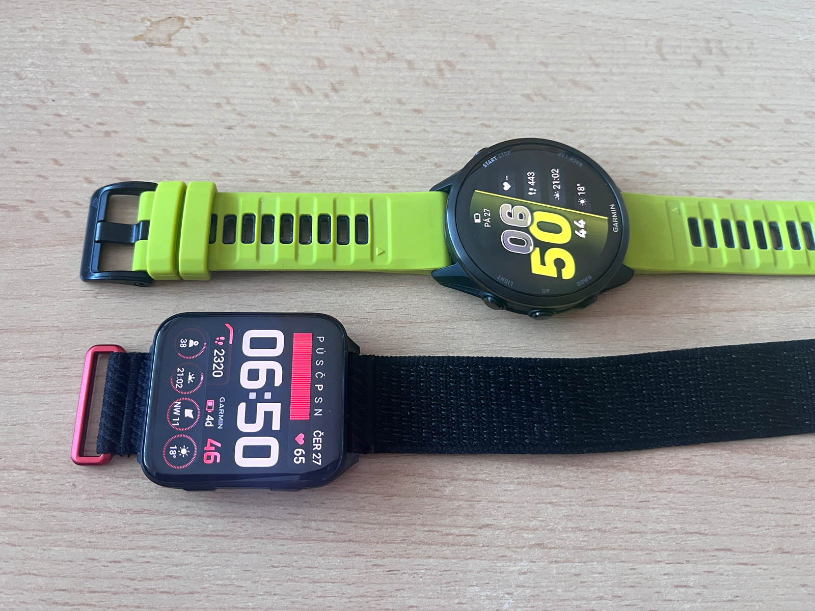 Když si na FR 970 nasadím řemínek UltraFit, dostávám se s hmotností na 45 gramů, Venu X1 přitom váží 40 gramů. Rozdíl v hmotnosti je tedy zanedbatelný. Spíš než hmotnost jde o tloušťku, kdy Venu X1 na ruce nezavazí, a hlavně s nimi málokdy třísknu o futra. Dokonce i smeták mezi ledničkou a zdí vytáhnu, což se mi s FR 970 nepodaří. Tady i milimetry hrají roli.