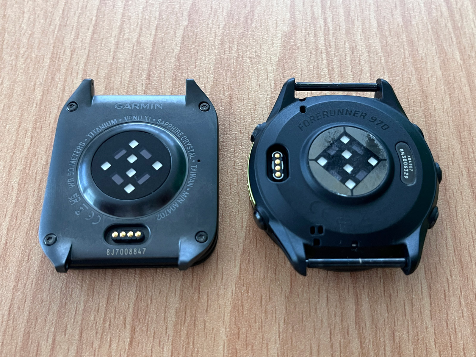 Kulaté a hranaté. Vzhled hodinek už nemohl být odlišnější. Zatímco FR 970 jsou klasické hodinky Garminu, Venu X1 spíše připomínají řadu čínské produkce či Apple Watch. Forerunnery mají navíc lunetu, sice tenkou, ale je tam. Na Venu je pak displej přímo usazen do polymerového těla. Oba modely mají zaoblený safír, který lehce vystupuje nad lunetu, resp. tělo hodinek. Když hodinky položím na stůl, oboje se ho dotýkají plochou safíru.