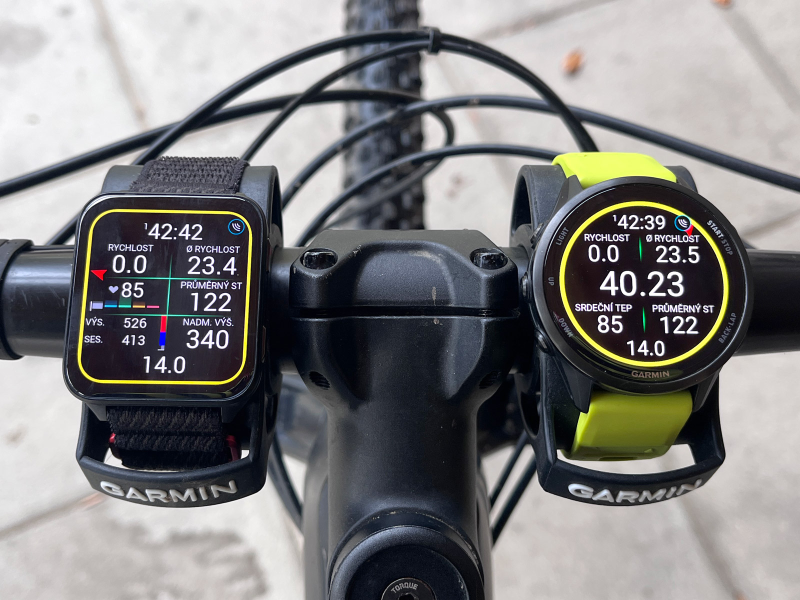 Forerunnery zvládají s mapou také šest datových polí, ale ty jsou rozmístěné na okruhu, jsou malá a špatně čitelná, resp. nejsou čitelná vůbec (a výrazně zmenší plochu mapy). Jediné opravdu použitelné rozvržení s daty je zde jedno pole v dolní části, případně tři pole nalevo – a mapa má pak jen půlku displeje vpravo. Když si zapnu dvě datová pole, tak šipka s pozicí uskakuje nahoru a vy vidíte jen malý kus před sebe.