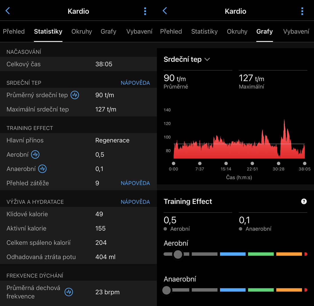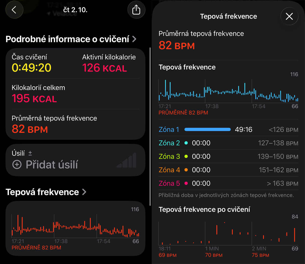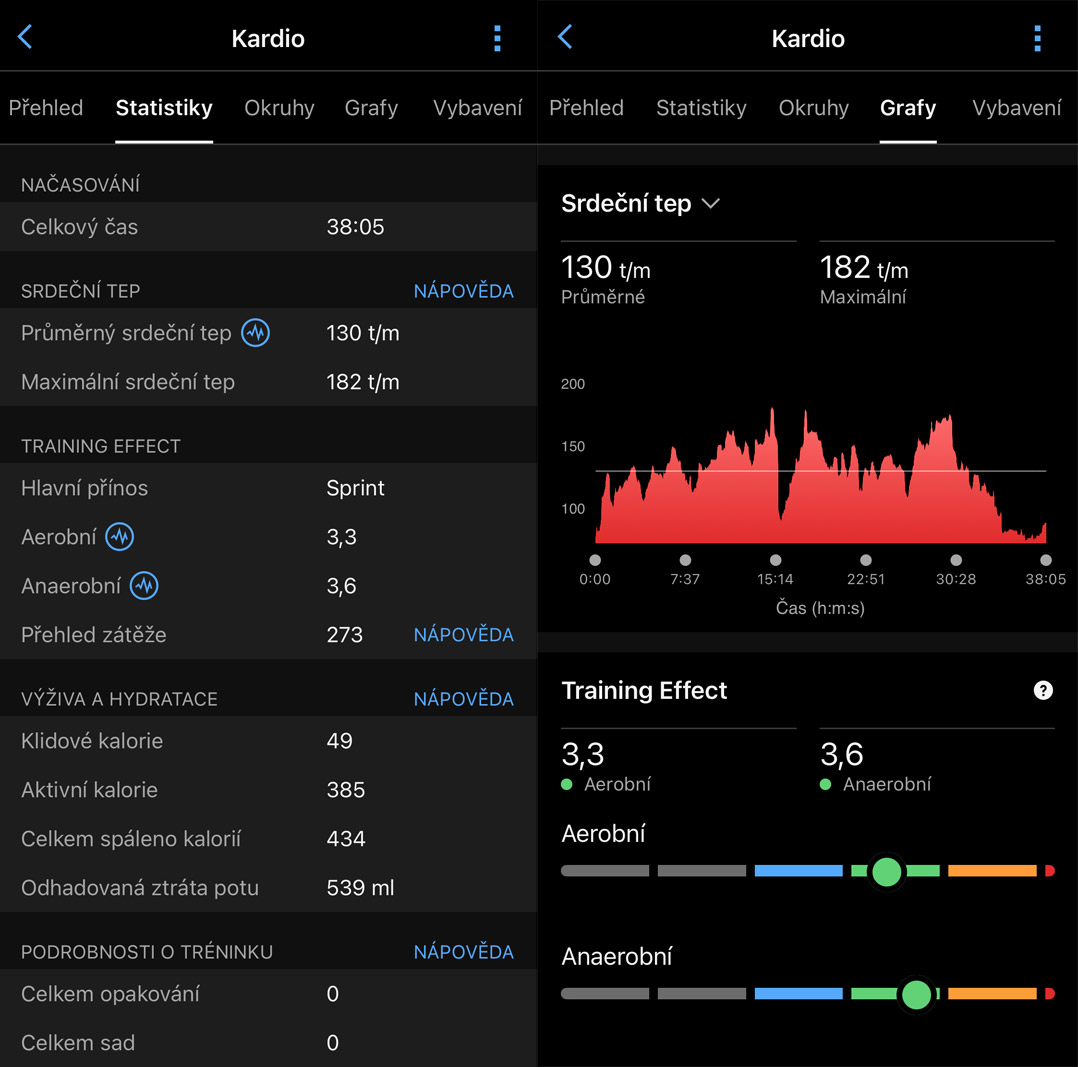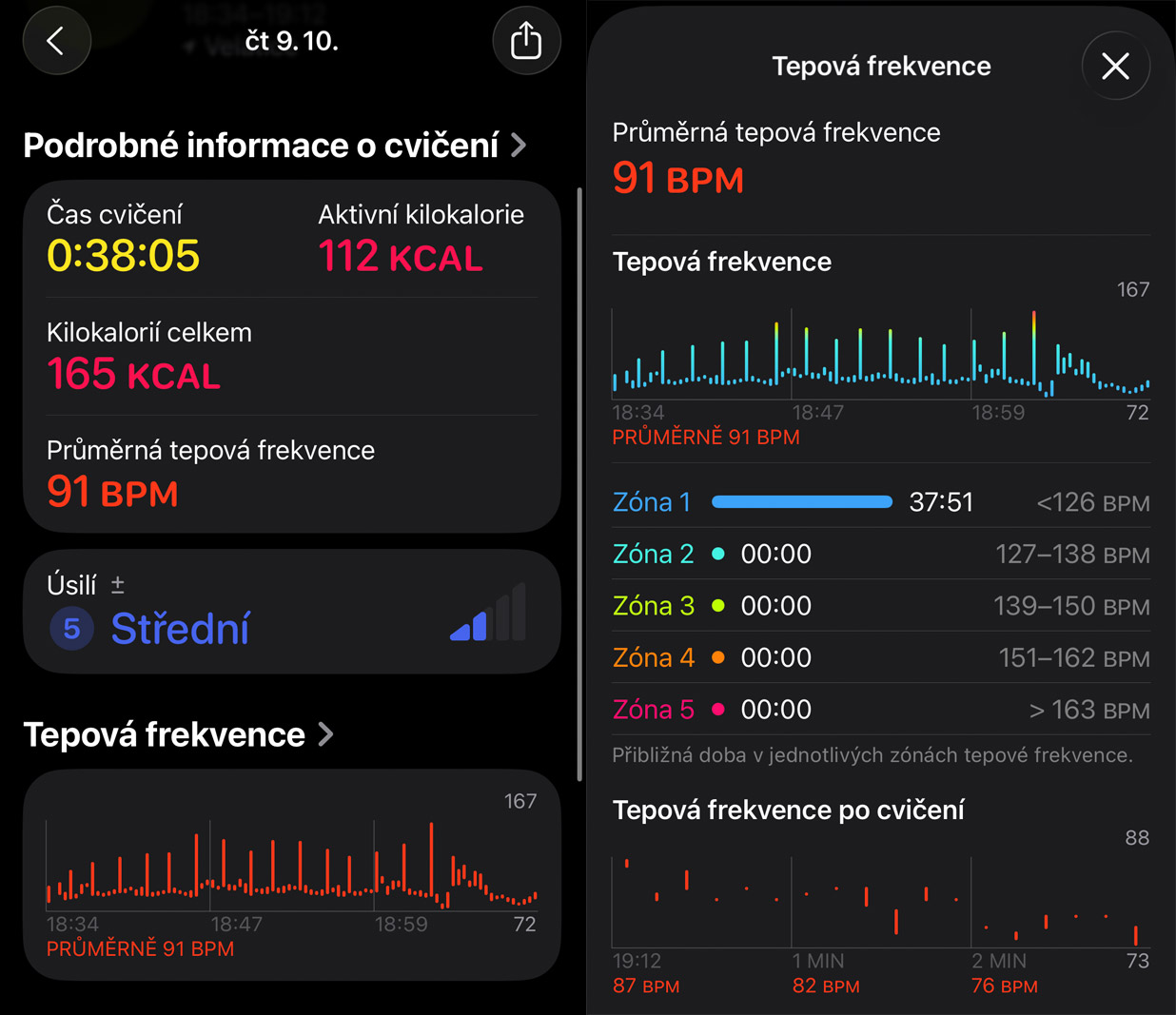Graf z měření Apple Watch se nějak podivně rozpadl, přibyly špičky, které tam těsně po dokončení měření nebyly, takže to nějak nedává smysl. Nicméně těsně po ukončení aktivity bylo vše v pořádku a graf z AW odpovídal tomu, co naměřil hrudní pás. Když jsem se díval do historie na starší cvičení, nikde jinde se mi to nestalo. Přidal jsem proto ještě jeden záznam stejného, ale staršího cvičení, kde je graf tepovky v pohodě.