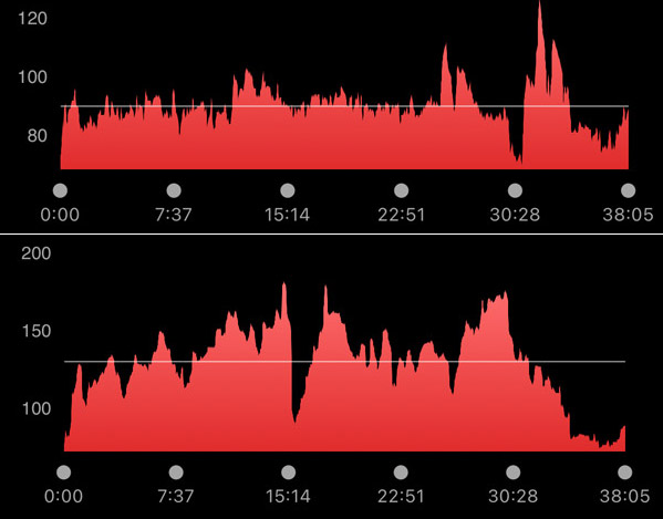 Málokdy se mi stane, že by hodinky Garminu změřily při této aktivitě mou tepovku správně. Běžně mívám 80-90 tp/m, ale hodinky mi bez problému měří průměry 130-140 tp/m a maximálku 180-190 tp/m. Občas se mi to stane i při běžném posilování (shyby, kliky, bradla, bench, jednoručky...), ale tam mám pauzu mezi sériemi a ustřelená tepovka se stačí „zklidnit“, když nehýbu rukama.
