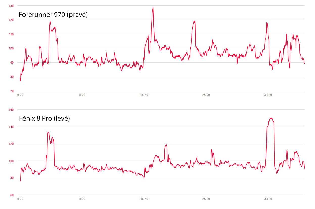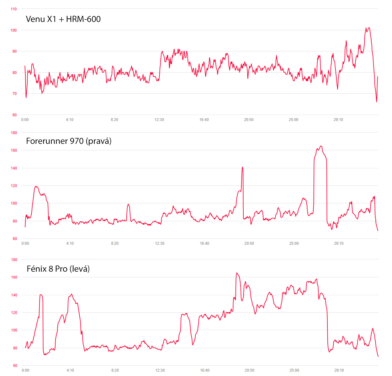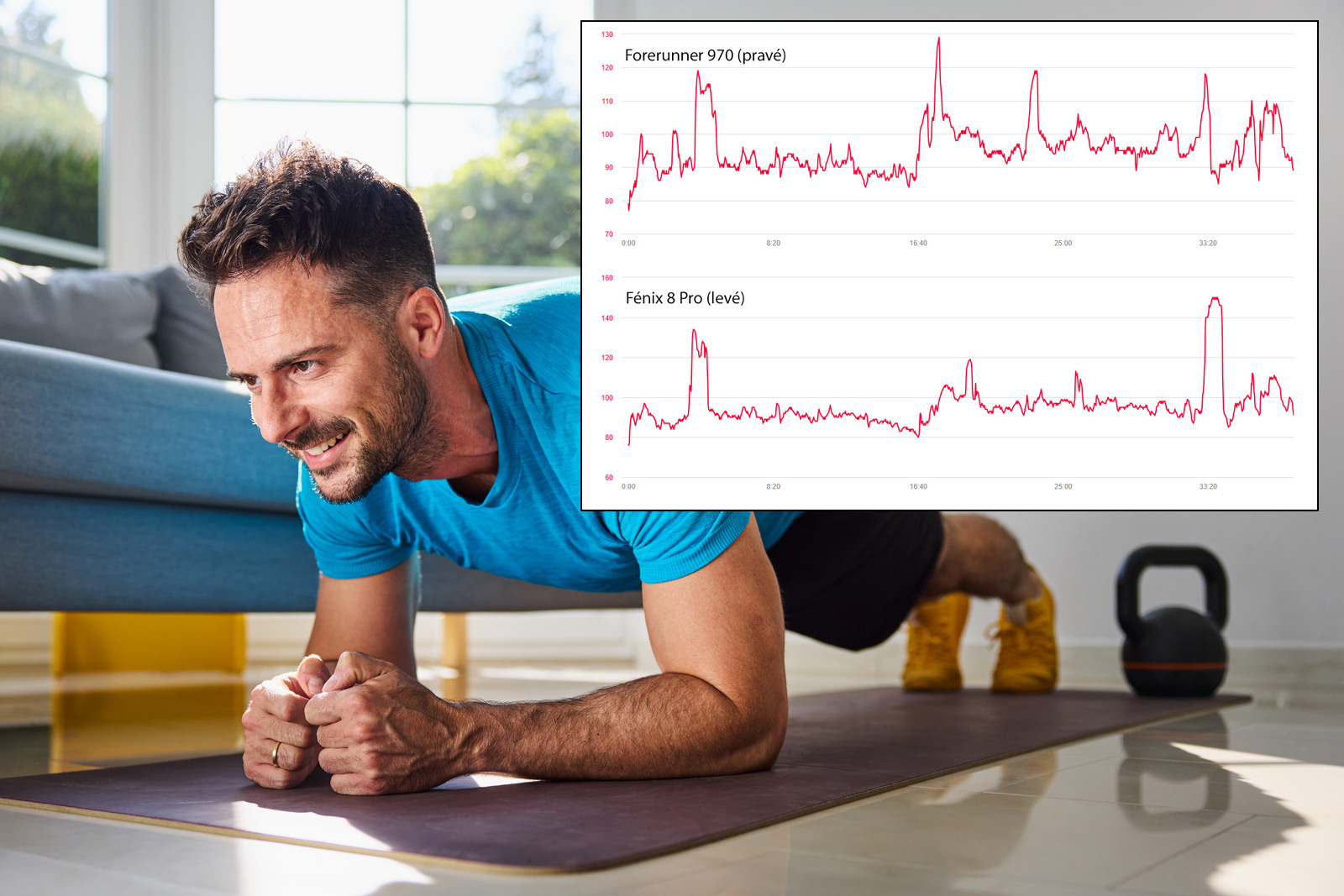 O pár dnů později jsem si dal totéž cvičení, opět na levé ruce Fénixy 8 Pro a na pravé Forerunnery 970. Řemínky jsem opět utáhl tak, aby se hodinky co nejméně hýbaly, ale současně mi to nebylo nepříjemné. Výsledek potěšil, Fénixy si udělaly jediný výlet do zóny Z4, jinak se tepovka držela tam, kde měla. Tentokrát jsem ale neměl třetí hodinky připojené k hruďáku pro srovnání.
