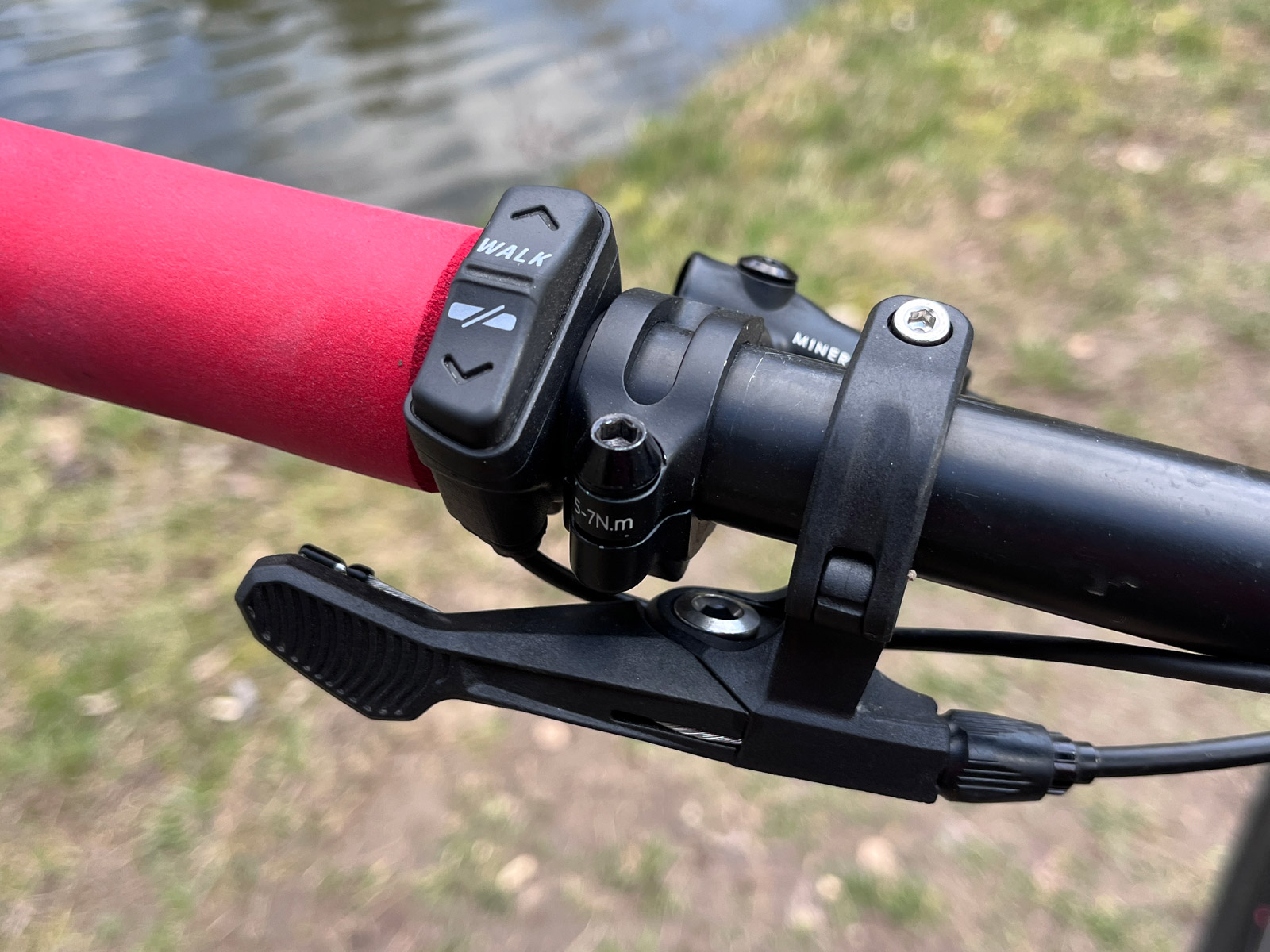 Fuel EXe skvěle skrývá, že jde o elektrokolo. Ať už motorem samotný, nebo jeho ovládáním. Na řídítkách je pouze malý přepínač režimů, který se krásně schová mezi grip a brzdu, není na něm žádný displej nebo diody. Samotný displej je pak přímo na horní rámové trubce, těsně za hlavou; to je mimochodem také důvod, proč kolo nemá Knock-Block, tedy zabránění protočení řídítek. Přiznám se, že mi to fakt chybí, všechna moje kole od Treku vč. Railu tuto funkci mají.