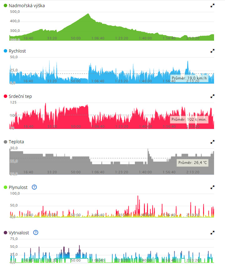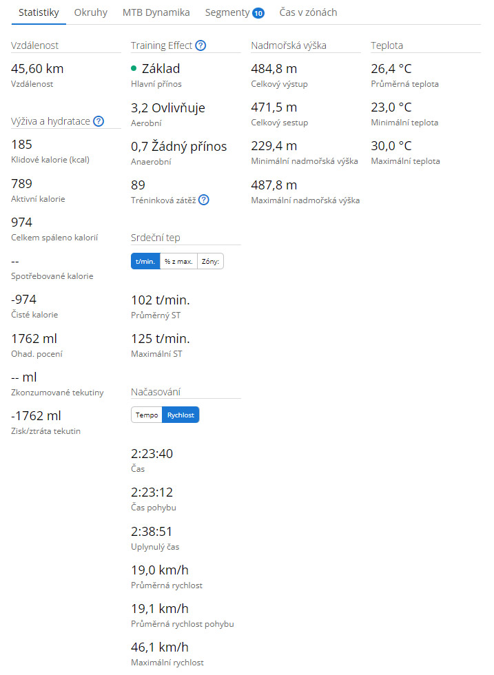 MTB metriky pak ukazují dynamiku jízdy a je to funkce určená pouze pro horská kola – aktivuje se jen tehdy, zvolíte-li patřičnou aktivitu. První metrika Plynulost ukazuje, jak se vám během jízdy daří udržovat stejnou rychlost. Přitom se samozřejmě zohledňují se faktory jako stálost rychlosti během celé jízdy, plynulost v zatáčkách a další. Obtížnost (v deníku Connect označeno jako Vytrvalost) pak měří náročnost jízdy, přičemž se zohledňují faktory jako sklon stezky a úhly zatáček. Pokud tedy pojedete lesním trailem, kde je řada překážek, klopenek, cesta se vlní nahoru a dolů, pak bude obtížnost vyšší než u rovné cesty po silnici, kde to můžete rozpálit třicítkou.