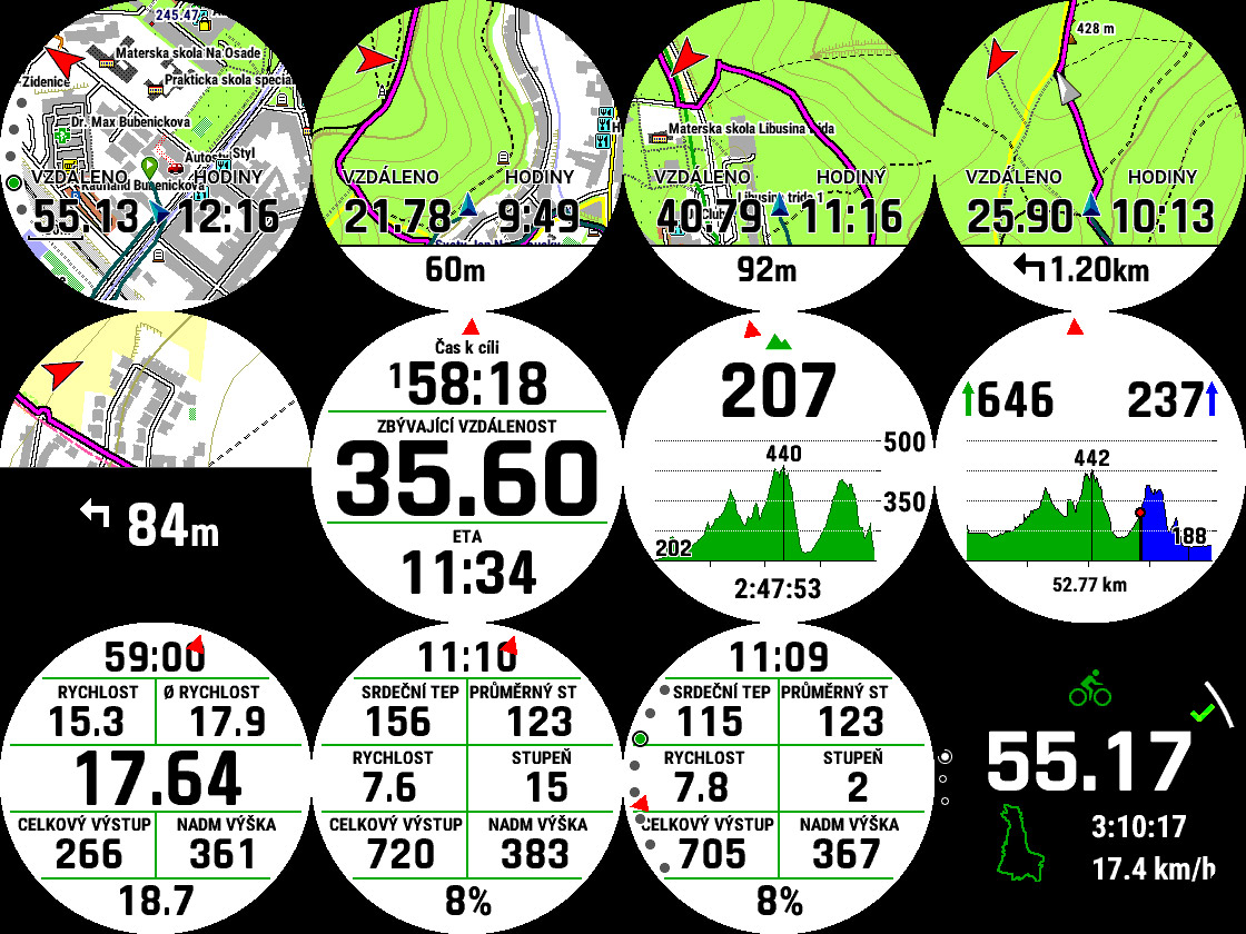 Při aktivitě se kromě standardních datových obrazovek zobrazují i další – na jedné vidíte graf stoupání, které vás čeká, takže víte, zda poběžíte/pojedete do kopce či z kopce, kolik výškových metrů ještě musíte zdolat apod. Další obrazovka ukazuje aktuální kurz a čas zbývající do konce, následuje trojice datových polí, z nichž se dozvíte, kolik zbývá do konce (vzdálenost a čas) a také ETA – čas, kdy dorazíte do cíle. Současně se na mapě, ale i na dalších obrazovkách, ukazují navigační instrukce současně se zvukovým a vibračním oznámením. Zkrátka klasika, která se už několik let nemění.