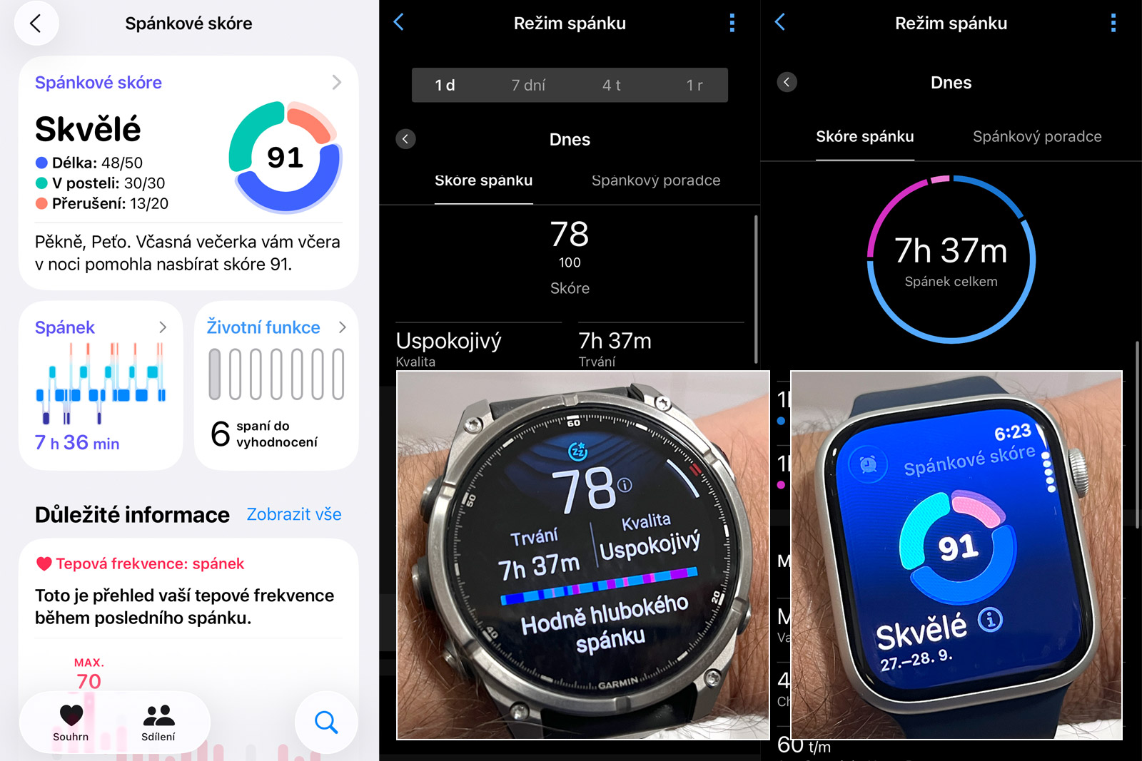 Zatímco Apple má jako tři hlavní kritéria čas uložení se do peřin, délku spánku a buzení se v noci, Garmin vyhodnocuje spánek komplexněji - do hodnocení přidává nejen fáze a délku spánku, ale také stres a průběh tepovky. Za mě Garmin více odpovídá tomu, jak jsem se vyspal v reálu.